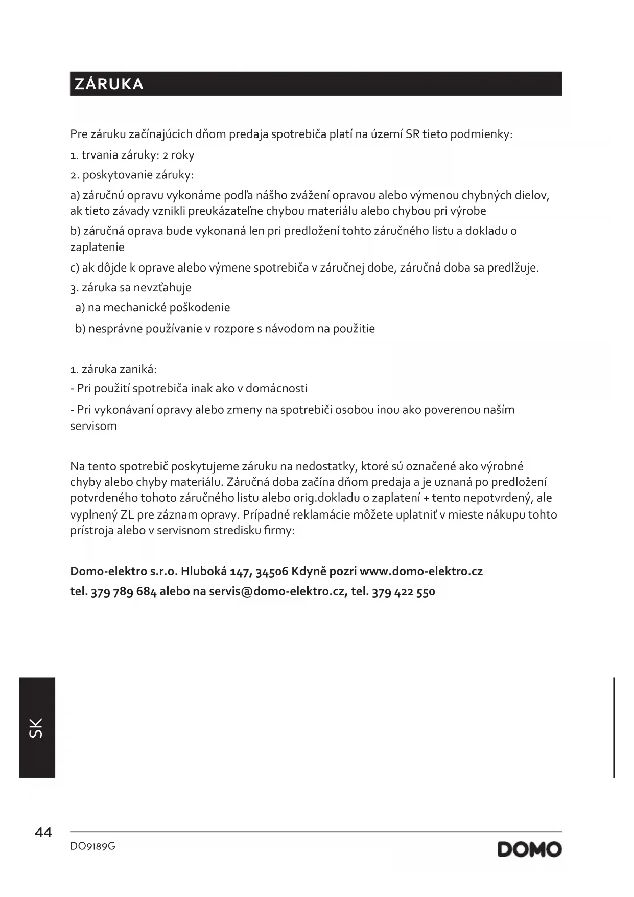 - Pri použití spotrebiča inak ako v domácnosti - Pri vykonávaní opravy alebo zmeny na spotrebiči osobou inou ako poverenou naším servisom Na tento spotrebič poskytujeme záruku na nedostatky, ktoré sú označené ako výrobné chyby alebo chyby materiálu. Záručná doba začína dňom predaja a je uznaná po predložení potvrdeného tohoto záručného listu alebo orig.dokladu o zaplatení + tento nepotvrdený, ale vyplnený ZL pre záznam opravy. Prípadné reklamácie môžete uplatniť v mieste nákupu tohto prístroja alebo v servisnom stredisku rmy: Domo-elektro s.r.o. Hluboká 147, 34506 Kdyně pozri www.domo-elektro.cz tel. 379 789 684 alebo na servis@domo-elektro.cz, tel. 379 422 55045 DO9189G www.domo-elektro.be