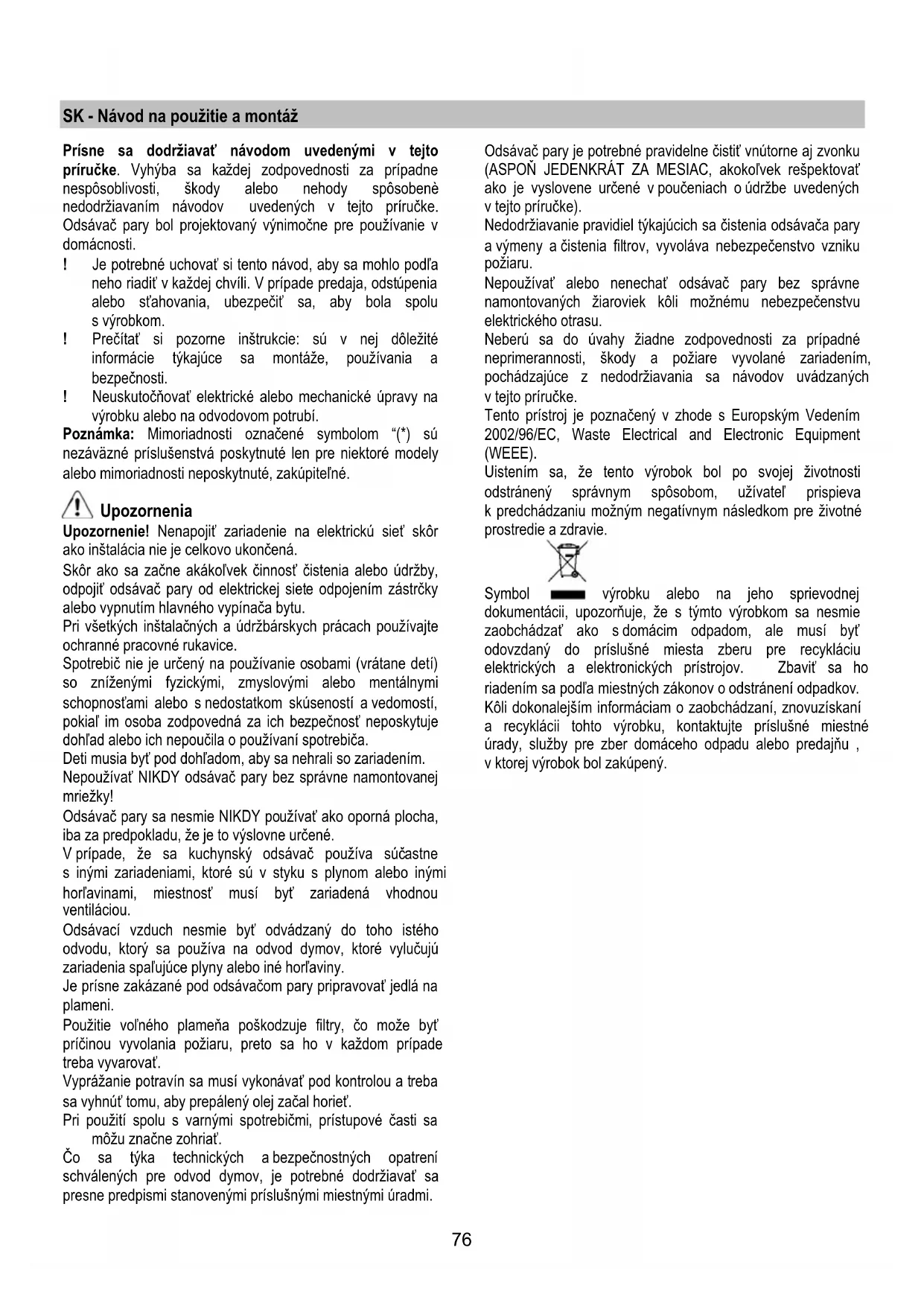 Вугільний фільтр (тільки в режимі рециркуляції) Мал. 13 Вбирає неприємні запахи кухні. Перевірка вугільного фільтру на насичення проводиться після більш менш довгого періоду використання в залежності від типу кухні і регулярності очистки фільтру жирів. У будь-якому випадку необхідно заміняти патрон максимум кожні чотири місяці. НЕ підлягає миттю чи поновленню. Заміна Ламп Мал. 14 Відключити прилад від електромережі. Увага! Перш ніж торкати лампи необхідно впевнитися що вони охололи. Якщо система підсвітки не працює, перевірте вірну установку ламп в гнізда, перед тим як звертатися до центру технічної допомоги.76 SK - Návod na použitie a montáž Prísne sa dodržiavať návodom uvedenými v tejto príručke. Vyhýba sa každej zodpovednosti za prípadne nespôsoblivosti, škody alebo nehody spôsobenè nedodržiavaním návodov uvedených v tejto príručke. Odsávač pary bol projektovaný výnimočne pre používanie v domácnosti. ! Je potrebné uchovať si tento návod, aby sa mohlo podľa neho riadiť v každej chvíli. V prípade predaja, odstúpenia alebo sťahovania, ubezpečiť sa, aby bola spolu s výrobkom. ! Prečítať si pozorne inštrukcie: sú v nej dôležité informácie týkajúce sa montáže, používania a bezpečnosti. ! Neuskutočňovať elektrické alebo mechanické úpravy na výrobku alebo na odvodovom potrubí. Poznámka: Mimoriadnosti označené symbolom “(*) sú nezáväzné príslušenstvá poskytnuté len pre niektoré modely alebo mimoriadnosti neposkytnuté, zakúpiteľné. Upozornenia Upozornenie! Nenapojiť zariadenie na elektrickú sieť skôr ako inštalácia nie je celkovo ukončená. Skôr ako sa začne akákoľvek činnosť čistenia alebo údržby, odpojiť odsávač pary od elektrickej siete odpojením zástrčky alebo vypnutím hlavného vypínača bytu. Pri všetkých inštalačných a údržbárskych prácach používajte ochranné pracovné rukavice. Spotrebič nie je určený na používanie osobami (vrátane detí) so zníženými fyzickými, zmyslovými alebo mentálnymi schopnosťami alebo s nedostatkom skúseností a vedomostí, pokiaľ im osoba zodpovedná za ich bezpečnosť neposkytuje dohľad alebo ich nepoučila o používaní spotrebiča. Deti musia byť pod dohľadom, aby sa nehrali so zariadením. Nepoužívať NIKDY odsávač pary bez správne namontovanej mriežky! Odsávač pary sa nesmie NIKDY používať ako oporná plocha, iba za predpokladu, že je to výslovne určené. V prípade, že sa kuchynský odsávač používa súčastne s inými zariadeniami, ktoré sú v styku s plynom alebo inými horľavinami, miestnosť musí byť zariadená vhodnou ventiláciou. Odsávací vzduch nesmie byť odvádzaný do toho istého odvodu, ktorý sa používa na odvod dymov, ktoré vylučujú zariadenia spaľujúce plyny alebo iné horľaviny. Je prísne zakázané pod odsávačom pary pripravovať jedlá na plameni. Použitie voľného plameňa poškodzuje filtry, čo može byť príčinou vyvolania požiaru, preto sa ho v každom prípade treba vyvarovať. Vyprážanie potravín sa musí vykonávať pod kontrolou a treba sa vyhnúť tomu, aby prepálený olej začal horieť. Pri použití spolu s varnými spotrebičmi, prístupové časti sa môžu značne zohriať. Čo sa týka technických a bezpečnostných opatrení schválených pre odvod dymov, je potrebné dodržiavať sa presne predpismi stanovenými príslušnými miestnými úradmi. Odsávač pary je potrebné pravidelne čistiť vnútorne aj zvonku (ASPOŇ JEDENKRÁT ZA MESIAC, akokoľvek rešpektovať ako je vyslovene určené v poučeniach o údržbe uvedených v tejto príručke). Nedodržiavanie pravidiel týkajúcich sa čistenia odsávača pary a výmeny a čistenia filtrov, vyvoláva nebezpečenstvo vzniku požiaru. Nepoužívať alebo nenechať odsávač pary bez správne namontovaných žiaroviek kôli možnému nebezpečenstvu elektrického otrasu. Neberú sa do úvahy žiadne zodpovednosti za prípadné neprimerannosti, škody a požiare vyvolané zariadením, pochádzajúce z nedodržiavania sa návodov uvádzaných v tejto príručke. Tento prístroj je poznačený v zhode s Europským Vedením 2002/96/EC, Waste Electrical and Electronic Equipment (WEEE). Uistením sa, že tento výrobok bol po svojej životnosti odstránený správnym spôsobom, užívateľ prispieva k predchádzaniu možným negatívnym následkom pre životné prostredie a zdravie. Symbol výrobku alebo na jeho sprievodnej dokumentácii, upozorňuje, že s týmto výrobkom sa nesmie zaobchádzať ako s domácim odpadom, ale musí byť odovzdaný do príslušné miesta zberu pre recykláciu elektrických a elektronických prístrojov. Zbaviť sa ho riadením sa podľa miestných zákonov o odstránení odpadkov. Kôli dokonalejším informáciam o zaobchádzaní, znovuzískaní a recyklácii tohto výrobku, kontaktujte príslušné miestné úrady, služby pre zber domáceho odpadu alebo predajňu , v ktorej výrobok bol zakúpený.77 Používanie Odsávač pary je realizovaný na požitie vo verzii odsávania a vonkajšej evakulácie alebo filtrácie s vnútornou recykláciou. Odsávacia verzia Odsávač pary je vybavený horným východom vzduchu B pre odvod dymov vonkajším smerom ( odvodová rúra a upevňovacie pásky nie sú dodané). Obr. 1 Filtračná verzia V prípade , že nie je možné odvádzať dymy a pary pochádzajúce z varenia smerom von, môže sa používať odsáva