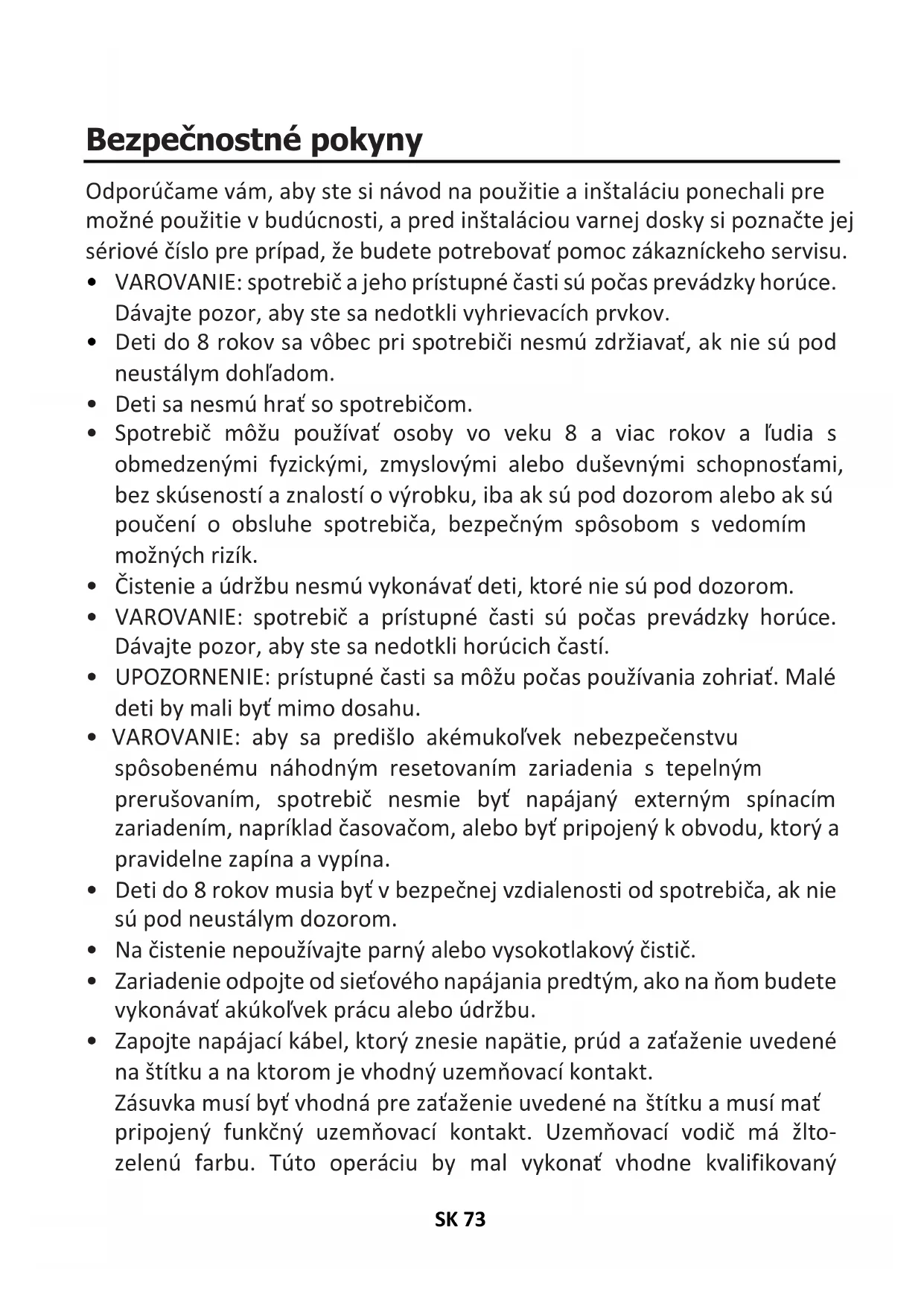 - Tento spotrebič nie je určený na ovládanie pomocou externého časovača alebo samostatného systému diaľkového ovládania.SK 76 Zhrnutie 73 Bezpečnostné pokyny 77 Pokyny pre inštalatéra 78 Pripojenia 80 Použitie varnej dosky – pokyny pre používateľa 81 Údržba a čistenie 81 Starostlivosť po zakúpení 82 Ochrana životného prostredia 83 Technické informácie