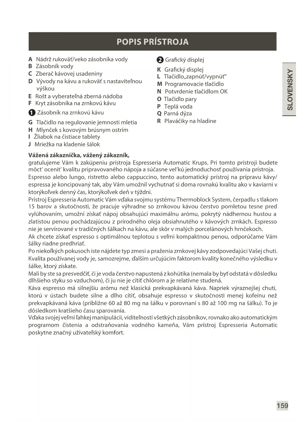 Gracký displej K Gracký displej L Tlačidlo„zapnúť/vypnúť“ M Programovacie tlačidlo N Potvrdenie tlačidlom OK O Tlačidlo pary P Teplá voda Q Parná dýza R Plaváčiky na hladine160 PRED PRVÝM POUŽITÍM PRÍSTROJA Meranie tvrdosti vody Pred prvým použitím prístroja alebo ak zistíte zmenu v tvrdosti vody je vhodné prispôsobiť prístroj zistenej tvrdosti vody. Ak chcete zistiť tvrdosť vody, urobte tak pomocou tyčinky dodanej spolu s prístrojom alebo sa obráťte na svojho dodávateľa vody. Prístroj sa Vás opýta na tvrdosť vody pri prvom použití. Stupeň tvrdosti