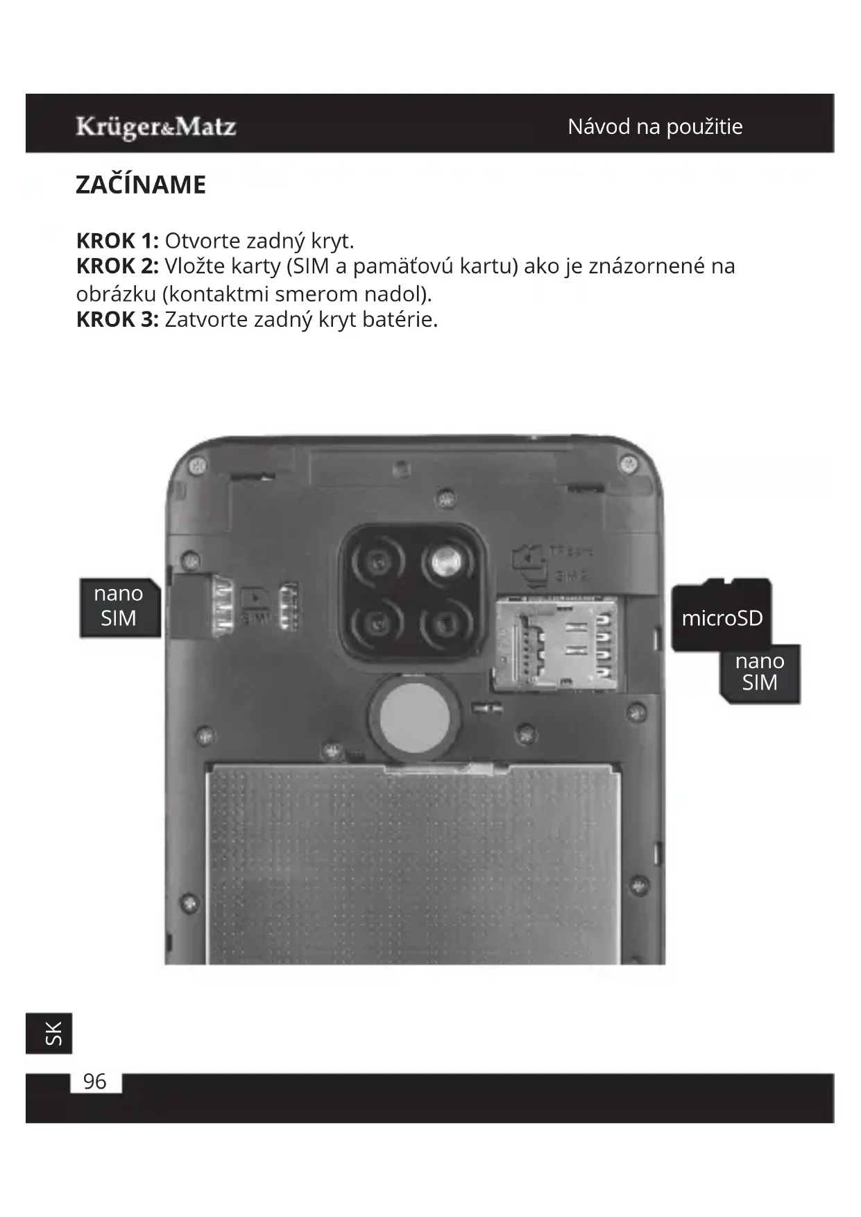 ZAČÍNAME KROK 1: Otvorte zadný kryt. KROK 2: Vložte karty (SIM apamäťovú kartu) ako je znázornené na obrázku (kontaktmi smerom nadol). KROK 3: Zatvorte zadný kryt batérie. microSD nano SIM nano SIMNávod na použitie