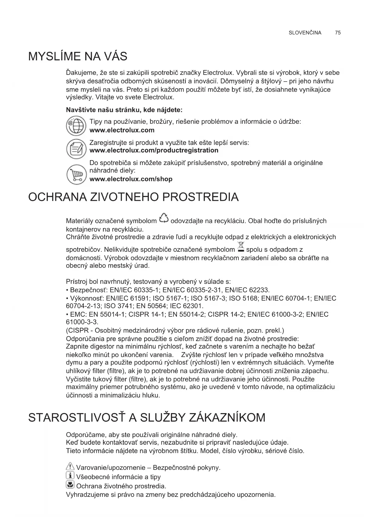Ďakujeme, že ste si zakúpili spotrebič značky Electrolux. Vybrali ste si výrobok, ktorý v sebe skrýva desaťročia odborných skúseností a inovácií. Dômyselný a štýlový – pri jeho návrhu sme mysleli na vás. Preto si pri každom použití môžete byť istí, že dosiahnete vynikajúce výsledky. Vitajte vo svete Electrolux. Navštívte našu stránku, kde nájdete: Tipy na používanie, brožúry, riešenie problémov a informácie o údržbe: www.electrolux.com Zaregistrujte si produkt a využite tak ešte lepší servis: www.electrolux.com/productregistration Do spotrebiča si môžete zakúpiť príslušenstvo, spotrebný materiál a originálne náhradné diely: www.electrolux.com/shop