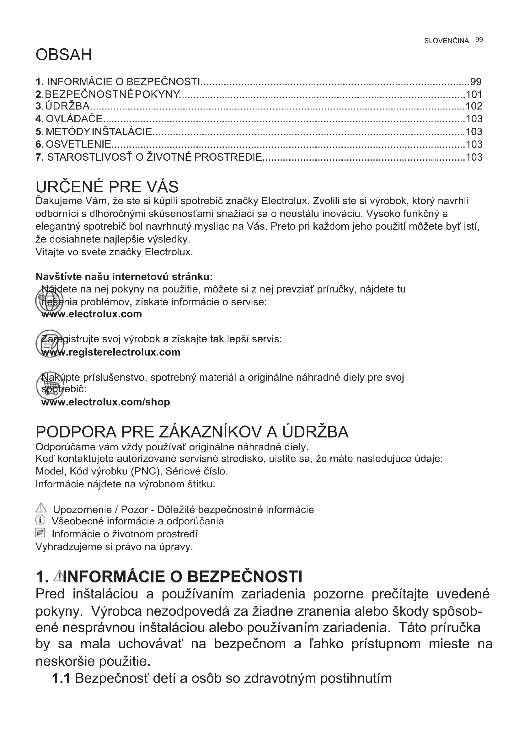 Ďakujeme Vám, že ste si kúpili spotrebič značky Electrolux. Zvolili ste si výrobok, ktorý navrhli odborníci s dlhoročnými skúsenosťami snažiaci sa o neustálu inováciu. Vysoko funkčný a elegantný spotrebič bol navrhnutý mysliac na Vás. Preto pri každom jeho použití môžete byť istí, že dosiahnete najlepšie výsledky. Vitajte vo svete značky Electrolux. Navštívte našu internetovú stránku: Nájdete na nej pokyny na použitie, môžete si z nej prevziať príručky, nájdete tu riešenia problémov, získate informácie o servise: www.electrolux.com Zaregistrujte svoj výrobok a získajte tak lepší servis: www.registerelectrolux.com Nakúpte príslušenstvo, spotrebný materiál a originálne náhradné diely pre svoj spotrebič: www.electrolux.com/shop PODPORA PRE ZÁKAZNÍKOV A ÚDRŽBA Odporúčame vám vždy používať originálne náhradné diely. Keď kontaktujete autorizované servisné stredisko, uistite sa, že máte nasledujúce údaje: Model, Kód výrobku (PNC), Sériové číslo. Informácie nájdete na výrobnom štítku. Upozornenie / Pozor - Dôležité bezpečnostné informácie Všeobecné informácie a odporúčania Informácie o životnom prostredí Vyhradzujeme si právo na úpravy.