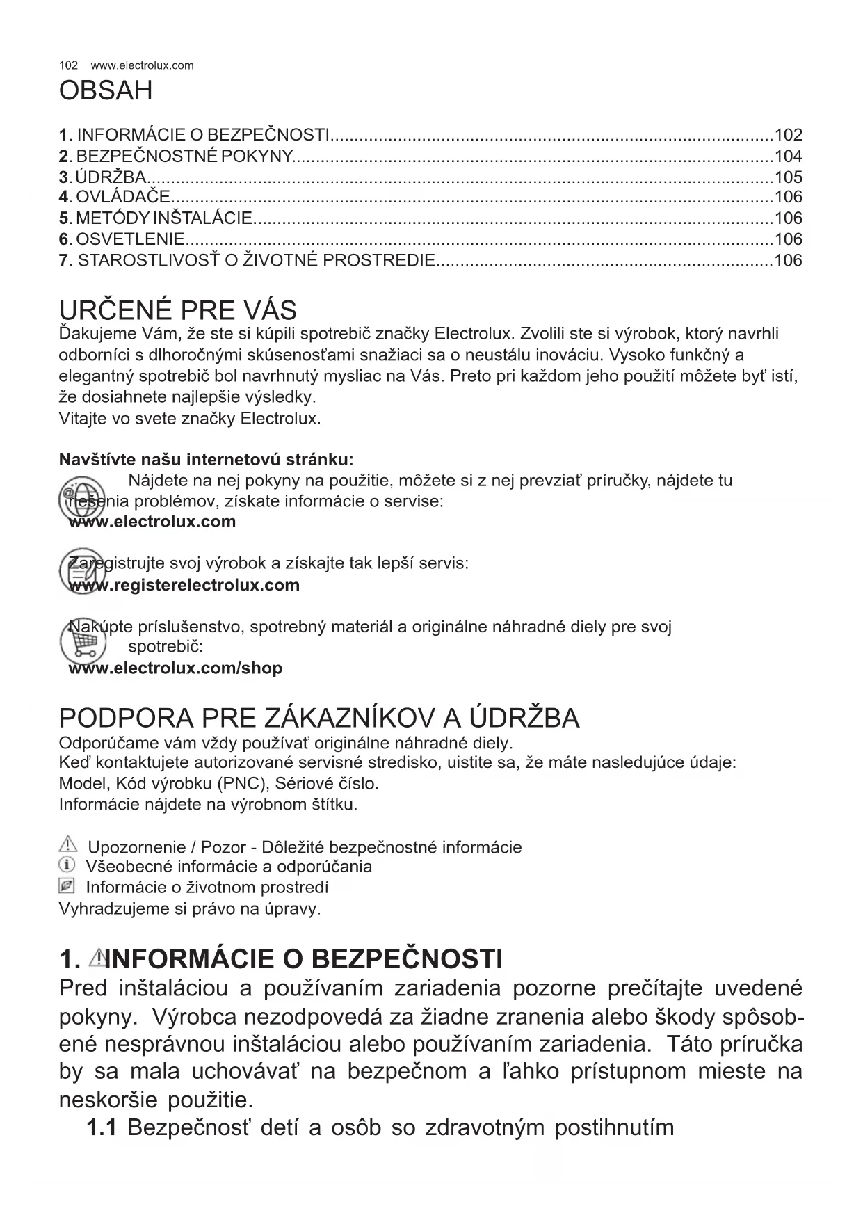 Ďakujeme Vám, že ste si kúpili spotrebič značky Electrolux. Zvolili ste si výrobok, ktorý navrhli odborníci s dlhoročnými skúsenosťami snažiaci sa o neustálu inováciu. Vysoko funkčný a elegantný spotrebič bol navrhnutý mysliac na Vás. Preto pri každom jeho použití môžete byť istí, že dosiahnete najlepšie výsledky. Vitajte vo svete značky Electrolux. Navštívte našu internetovú stránku: Nájdete na nej pokyny na použitie, môžete si z nej prevziať príručky, nájdete tu riešenia problémov, získate informácie o servise: www.electrolux.com Zaregistrujte svoj výrobok a získajte tak lepší servis: www.registerelectrolux.com Nakúpte príslušenstvo, spotrebný materiál a originálne náhradné diely pre svoj spotrebič: www.electrolux.com/shop PODPORA PRE ZÁKAZNÍKOV A ÚDRŽBA Odporúčame vám vždy používať originálne náhradné diely. Keď kontaktujete autorizované servisné stredisko, uistite sa, že máte nasledujúce údaje: Model, Kód výrobku (PNC), Sériové číslo. Informácie nájdete na výrobnom štítku. Upozornenie / Pozor - Dôležité bezpečnostné informácie Všeobecné informácie a odporúčania Informácie o životnom prostredí Vyhradzujeme si právo na úpravy.