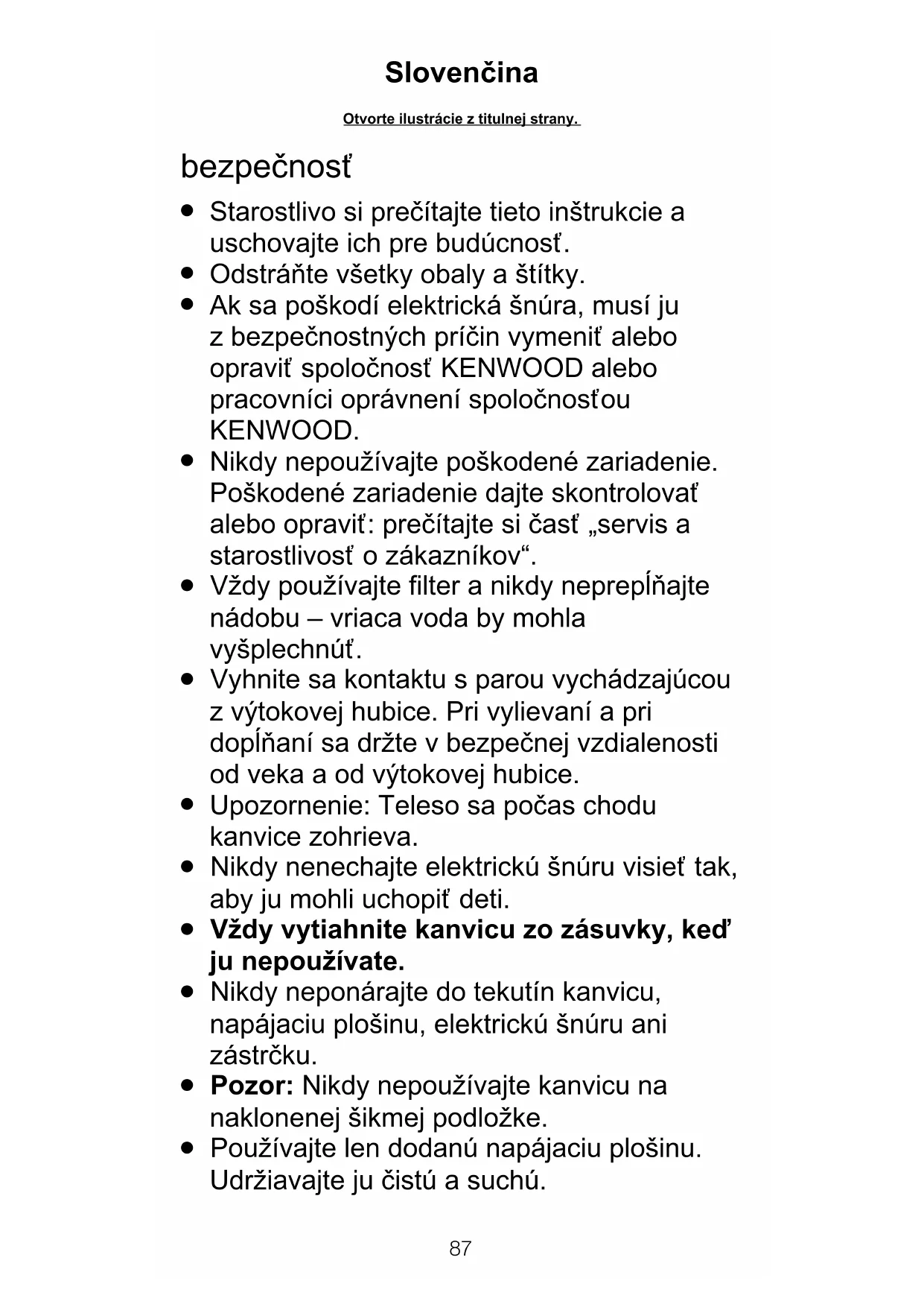 Toto zariadenie používajte len v domácnosti na stanovený účel. Spoločnosť Kenwood nepreberie žiadnu zodpovednosť za následky nesprávneho používania zariadenia, ako ani za následky nerešpektovania týchto inštrukcií.Ochrana proti ohrievaniu bez vody (za sucha)