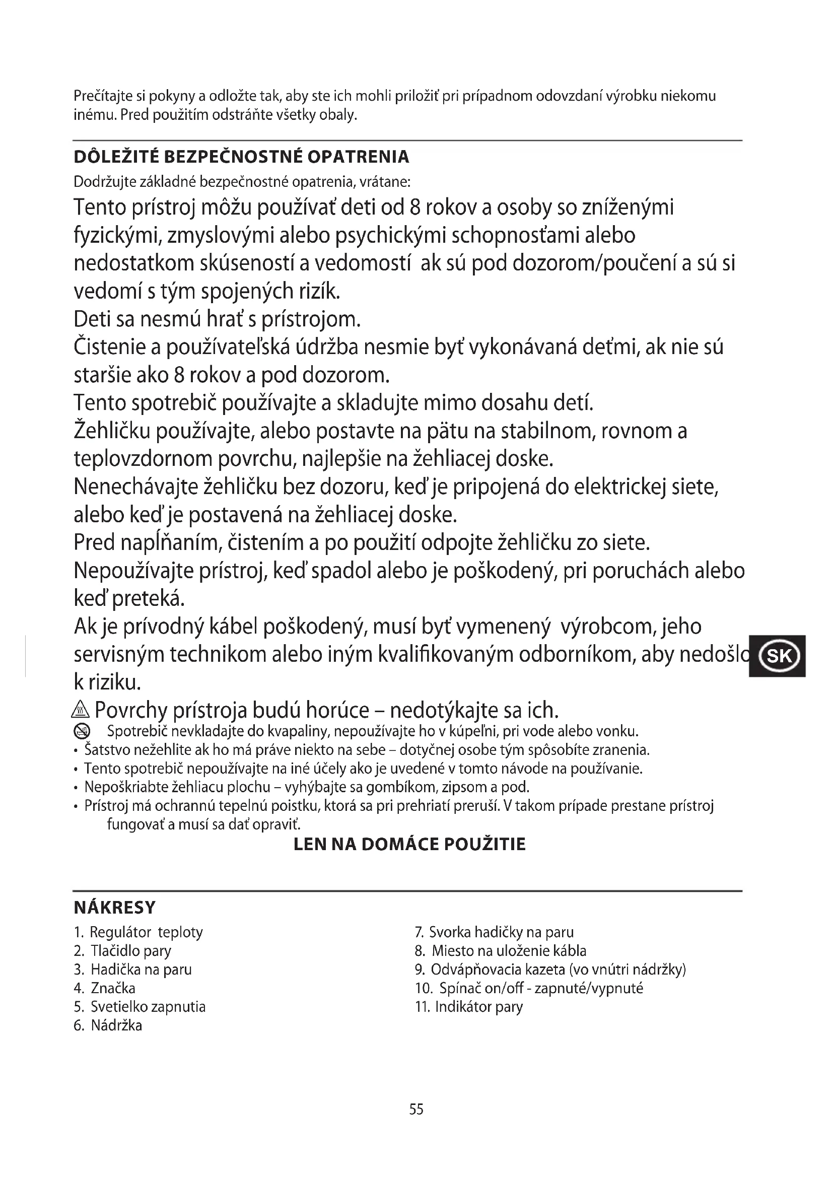 Dodržujte základné bezpečnostné opatrenia, vrátane: Tento prístroj môžu používať deti od 8 rokov a osoby so zníženými fyzickými, zmyslovými alebo psychickými schopnosťami alebo nedostatkom skúseností a vedomostí ak sú pod dozorom/poučení a sú si vedomí s tým spojených rizík. Deti sa nesmú hrať s prístrojom. Čistenie a používateľská údržba nesmie byť vykonávaná deťmi, ak nie sú staršie ako 8 rokov a pod dozorom. Tento spotrebič používajte a skladujte mimo dosahu detí. Žehličku používajte, alebo postavte na pätu na stabilnom, rovnom a teplovzdornom povrchu, najlepšie na žehliacej doske. Nenechávajte žehličku bez dozoru, keď je pripojená do elektrickej siete, alebo keď je postavená na žehliacej doske. Pred napĺňaním, čistením a po použití odpojte žehličku zo siete. Nepoužívajte prístroj, keď spadol alebo je poškodený, pri poruchách alebo keď preteká. Ak je prívodný kábel poškodený, musí byť vymenený výrobcom, jeho servisným technikom alebo iným kvalikovaným odborníkom, aby nedošlo k riziku. h Povrchy prístroja budú horúce – nedotýkajte sa ich.