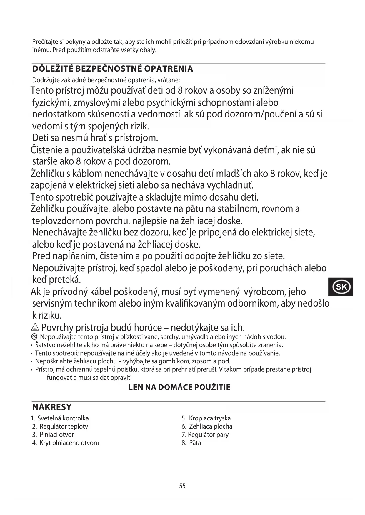 Dodržujte základné bezpečnostné opatrenia, vrátane: Tento prístroj môžu používať deti od 8 rokov a osoby so zníženými fyzickými, zmyslovými alebo psychickými schopnosťami alebo nedostatkom skúseností a vedomostí ak sú pod dozorom/poučení a sú si vedomí s tým spojených rizík. Deti sa nesmú hrať s prístrojom. Čistenie a používateľská údržba nesmie byť vykonávaná deťmi, ak nie sú staršie ako 8 rokov a pod dozorom. Žehličku s káblom nenechávajte v dosahu detí mladších ako 8 rokov, keď je zapojená v elektrickej sieti alebo sa necháva vychladnúť. Tento spotrebič používajte a skladujte mimo dosahu detí. Žehličku používajte, alebo postavte na pätu na stabilnom, rovnom a teplovzdornom povrchu, najlepšie na žehliacej doske. Nenechávajte žehličku bez dozoru, keď je pripojená do elektrickej siete, alebo keď je postavená na žehliacej doske. Pred napĺňaním, čistením a po použití odpojte žehličku zo siete. Nepoužívajte prístroj, keď spadol alebo je poškodený, pri poruchách alebo keď preteká. Ak je prívodný kábel poškodený, musí byť vymenený výrobcom, jeho servisným technikom alebo iným kvalikovaným odborníkom, aby nedošlo k riziku. h Povrchy prístroja budú horúce – nedotýkajte sa ich. b Nepoužívajte tento prístroj v blízkosti vane, sprchy, umývadla alebo iných nádob s vodou.