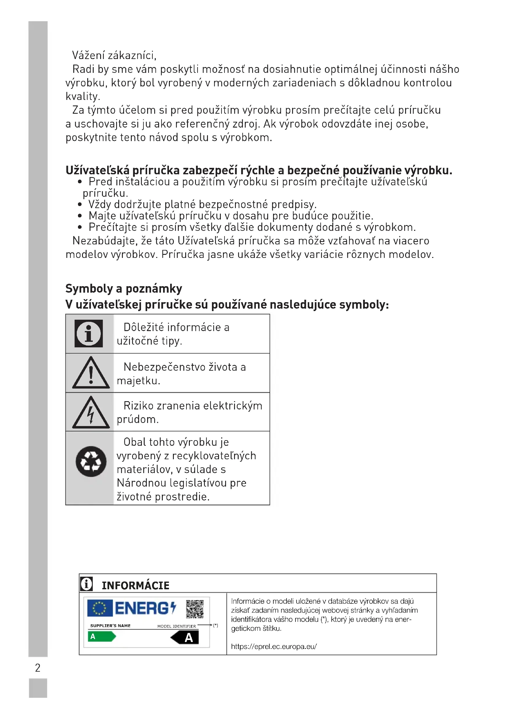 Rizikozraneniaelektrickým prúdom. Obaltohtovýrobkuje vyrobenýzrecyklovateľných materiálov,vsúlades Národnoulegislatívoupre životnéprostredie. INFORMÁCIE Informácie o modeli uložené v databáze výrobkov sa dajú získať zadaním nasledujúcej webovej stránky a vyhľadaním identifikátora vášho modelu (*), ktorý je uvedený na ener- getickom štítku.https://eprel.ec.europa.eu/