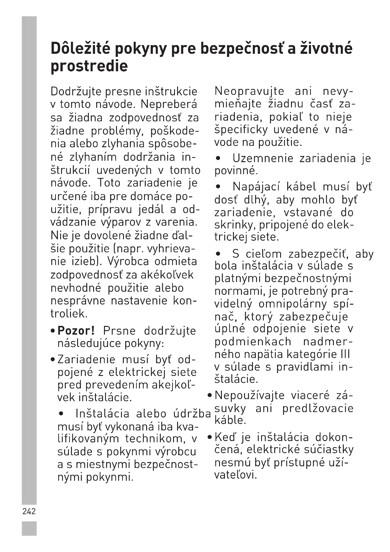 - Keď je inštalácia dokon- čená, elektrické súčiastky nesmú byť prístupné uží- vateľovi.243 Dôležité pokyny pre bezpečnosť a životné prostredie