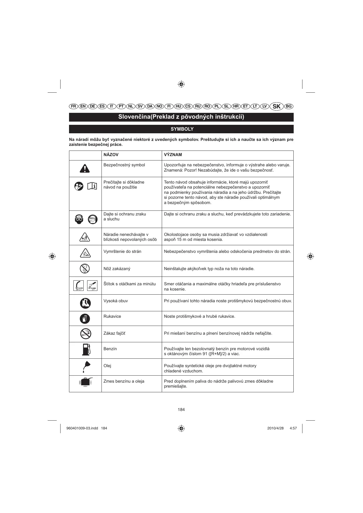 Sloven/ina(Preklad z pôvodných inštrukcií) SYMBOLY Na náradí môžu byť vyznačené niektoré z uvedených symbolov. Preštudujte si ich a naučte sa ich význam pre zaistenie bezpečnej práce. NÁZOV VÝZNAM Bezpečnostný symbol Upozorňuje na nebezpečenstvo, informuje o výstrahe alebo varuje. Znamená: Pozor! Nezabúdajte, že ide o vašu bezpečnosť. Prečítajte si dôkladne návod na použitie Tento návod obsahuje informácie, ktoré majú upozorniť používateľa na potenciálne nebezpečenstvo a upozorniť na podmienky používania náradia a na jeho údržbu. Prečítajte si pozorne tento návod, aby ste náradie používali optimálnym a bezpečným spôsobom. Dajte si ochranu zraku a sluchu Dajte si ochranu zraku a sluchu, keď prevádzkujete toto zariadenie. Náradie nenechávajte v blízkosti nepovolaných osôb Okolostojace osoby sa musia zdržiavať vo vzdialenosti aspoň 15 m od miesta kosenia. Vymrštenie do strán Nebezpečenstvo vymrštenia alebo odskočenia predmetov do strán. Nôž zakázaný Neinštalujte akýkoľvek typ noža na toto náradie. Štítok s otáčkami za minútu Smer otáčania a maximálne otáčky hriadeľa pre príslušenstvo na kosenie. Vysoká obuv Pri používaní tohto náradia noste protišmykovú bezpečnostnú obuv. Rukavice Noste protišmykové a hrubé rukavice. Zákaz fajčiť Pri miešaní benzínu a plnení benzínovej nádrže nefajčite. Benzín Používajte len bezolovnatý benzín pre motorové vozidlá s oktánovým číslom 91 ([R+M]/2) a viac. Olej Používajte syntetické oleje pre dvojtaktné motory chladené vzduchom. Zmes benzínu a oleja Pred doplnením paliva do nádrže palivovú zmes dôkladne premiešajte.