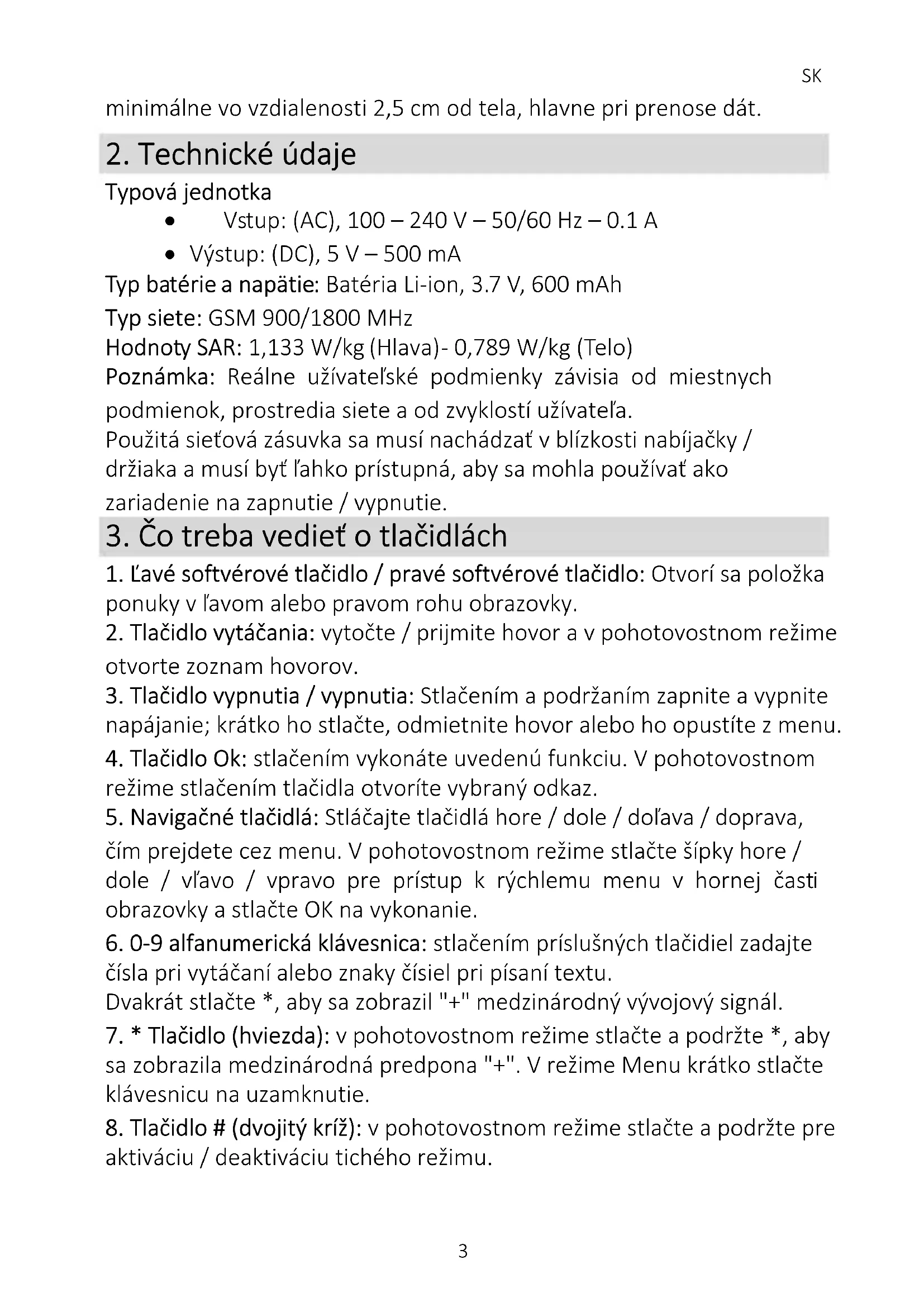 - Výstup: (DC), 5 V – 500 mA Typ batérie a napätie: Batéria Li-ion, 3.7 V, 600 mAh Typ siete: GSM 900/1800 MHz Hodnoty SAR: 1,133 W/kg (Hlava) - 0,789 W/kg (Telo) Poznámka: Reálne užívateľské podmienky závisia od miestnych podmienok, prostredia siete a od zvyklostí užívateľa. Použitá sieťová zásuvka sa musí nachádzať v blízkosti nabíjačky / držiaka a musí byť ľahko prístupná, aby sa mohla používať ako zariadenie na zapnutie / vypnutie.