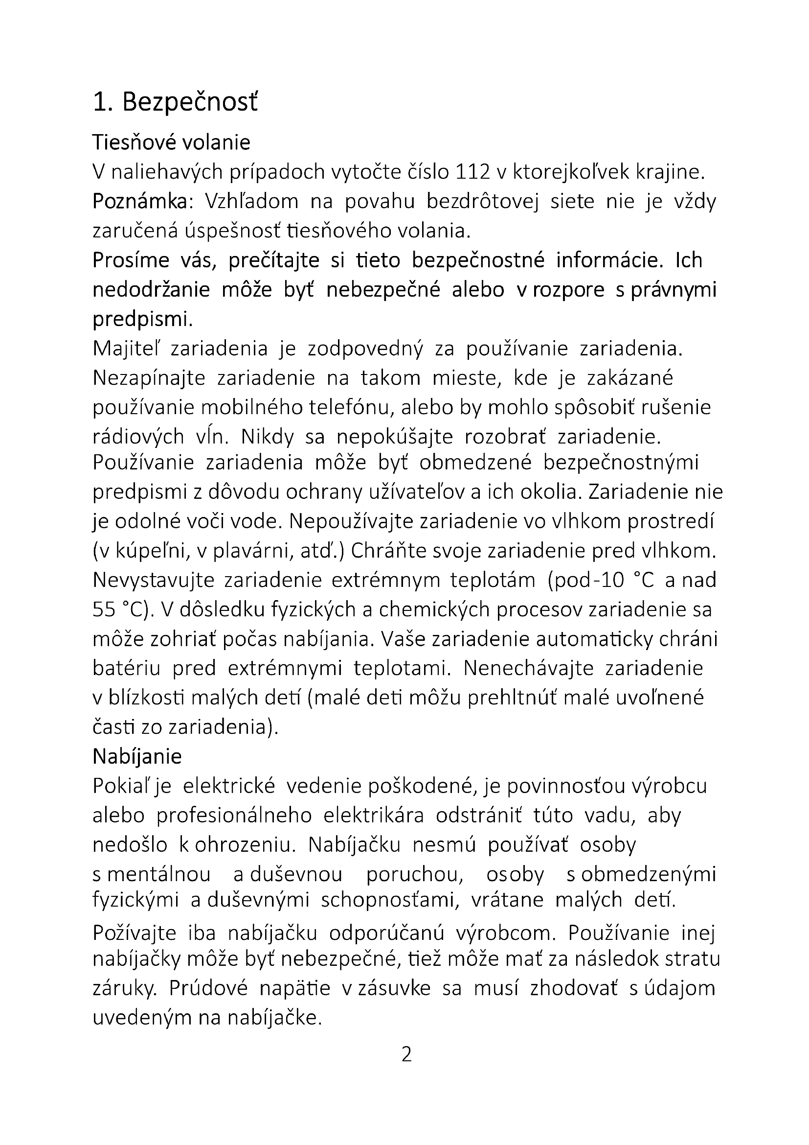 Tiesňové volanie V naliehavých prípadoch vytočte číslo 112 v ktorejkoľvek krajine. Poznámka: Vzhľadom na povahu bezdrôtovej siete nie je vždy zaručená úspešnosť tiesňového volania. Prosíme vás, prečítajte si tieto bezpečnostné informácie. Ich nedodržanie môže byť nebezpečné alebo v rozpore s právnymi predpismi. Majiteľ zariadenia je zodpovedný za používanie zariadenia. Nezapínajte zariadenie na takom mieste, kde je zakázané používanie mobilného telefónu, alebo by mohlo spôsobiť rušenie rádiových vĺn. Nikdy sa nepokúšajte rozobrať zariadenie. Používanie zariadenia môže byť obmedzené bezpečnostnými predpismi z dôvodu ochrany užívateľov a ich okolia. Zariadenie nie je odolné voči vode. Nepoužívajte zariadenie vo vlhkom prostredí (v kúpeľni, v plavárni, atď.) Chráňte svoje zariadenie pred vlhkom. Nevystavujte zariadenie extrémnym teplotám (pod -10 °C a nad 55 °C). V dôsledku fyzických a chemických procesov zariadenie sa môže zohriať počas nabíjania. Vaše zariadenie automaticky chráni batériu pred extrémnymi teplotami. Nenechávajte zariadenie v blízkosti malých detí (malé deti môžu prehltnúť malé uvoľnené časti zo zariadenia). Nabíjanie Pokiaľ je elektrické vedenie poškodené, je povinnosťou výrobcu alebo profesionálneho elektrikára odstrániť túto vadu, aby nedošlo k ohrozeniu. Nabíjačku nesmú používať osoby s mentálnou a duševnou poruchou, osoby s obmedzenými fyzickými a duševnými schopnosťami, vrátane malých detí. Požívajte iba nabíjačku odporúčanú výrobcom. Používanie inej nabíjačky môže byť nebezpečné, tiež môže mať za následok stratu záruky. Prúdové napätie v zásuvke sa musí zhodovať s údajom uvedeným na nabíjačke.3 Používanie zariadenia počas letu Keď cestujete lietadlom, vypnite zariadenie vždy, keď vás na to upozorní personál alebo vás na to vyzvú signálom. Používanie mobilného telefónu môže rušiť elektronické navigačné prístroje lietadla. Používanie zariadenia napriek zákazu môže mať právne následky. Používanie zariadenia vo výbušnom a v inom obmedzenom prostredí Vypnite zariadenie vo výbušnom prostredí. Riaďte sa príslušnými nariadeniami a pokynmi. V takomto prostredí môžu vzniknúť iskry, ktoré môžu spôsobiť výbuch alebo požiar. Vypnite zariadenie na benzínových (plynových) čerpadlách, hlavne pri tesnej blízkosti palivových nádrží. V oblastiach zásobární chemikálií, výbušnín, trhavín dodržiavajte všetky pokyny. Elektronické zariadenia Nenechávajte dlhší čas mobilné zariadenie v blízkosti elektronických zariadení, lebo to môže mať za následok demagnetizáciu. Elektronické zdravotnícke zariadenia Mobilný telefón je rádiový vysielač, ktorý môže narušiť fungovanie elektronických lekárskych prístrojov, implantátov, sluchových protéz, pacemakerov, inzulínových púmp, atď. Odporúča sa dodržiavať vzdialenosť min. 15 cm medzi zariadením a implantátom. Nikdy nenoste mobilný telefón v náprsnom vrecku. Riaďte sa pokynmi výrobcu lekárskeho elektronického prístroja. V tom prípade, ak ste nositeľom implantátu, informujte sa u svojho ošetrujúceho lekára ohľadne používania mobilného telefónu. Nemocnica V nemocniciach alebo iných zdravotníckych zariadeniach môžu sa nachádzať také prístroje, ktoré môžu citlivo reagovať na vonkajšie rádiofrekvenčné signály. Vypnite svoj telefón, ak vás na to4 upozornia signály, alebo vás o to poprosí personál nemocnice. Bezpečnosť cestnej premávky Informujte sa o predpisoch a nariadeniach týkajúcich sa používania mobilného zariadenia pri vedení motorového vozidla. Nepoužívajte mobilný telefón počas jazdy. Keď telefonujete, pokiaľ je to možné, používajte hlasitý odposluch alebo slúchadlá. V prípade prichádzajúceho hovoru odbočte z vozovky a zastavte vozidlo. Rádiové signály vysielané zariadením môžu spôsobiť poruchu elektronického zariadenia automobilu, vrátane autohifi a alarmu. Pokiaľ vo vašom vozidle sa nachádza airbag, dbajte na to, aby príslušenstvá mobilného telefónu neboli v ceste. Nedokonalé fungovanie airbagu môže spôsobiť vážne poranenia. Užívateľské prostredie Zariadenie spĺňa medzinárodné smernice o vystavení rádiovým vlnám. Neprekračuje odporúčané limity. Držte zariadenie vo vzdialenosti minimálne 1,5 cm od ucha. Keď mobilný telefón nosíte v puzdre, na opasku alebo v držiaku, dbajte na to, aby tieto veci neobsahovali kov a tiež na to, aby telefón bol trošku ďalej od tela. Pokiaľ sa používajú iné ako odporúčané príslušenstvá, výrobca nezaručuje smerniciam vyhovujúce frekvencie. Keď nepoužívate puzdro, držte zariadenie minimálne vo vzdialenosti 2,5 cm od tela, hlavne pri prenose dát.