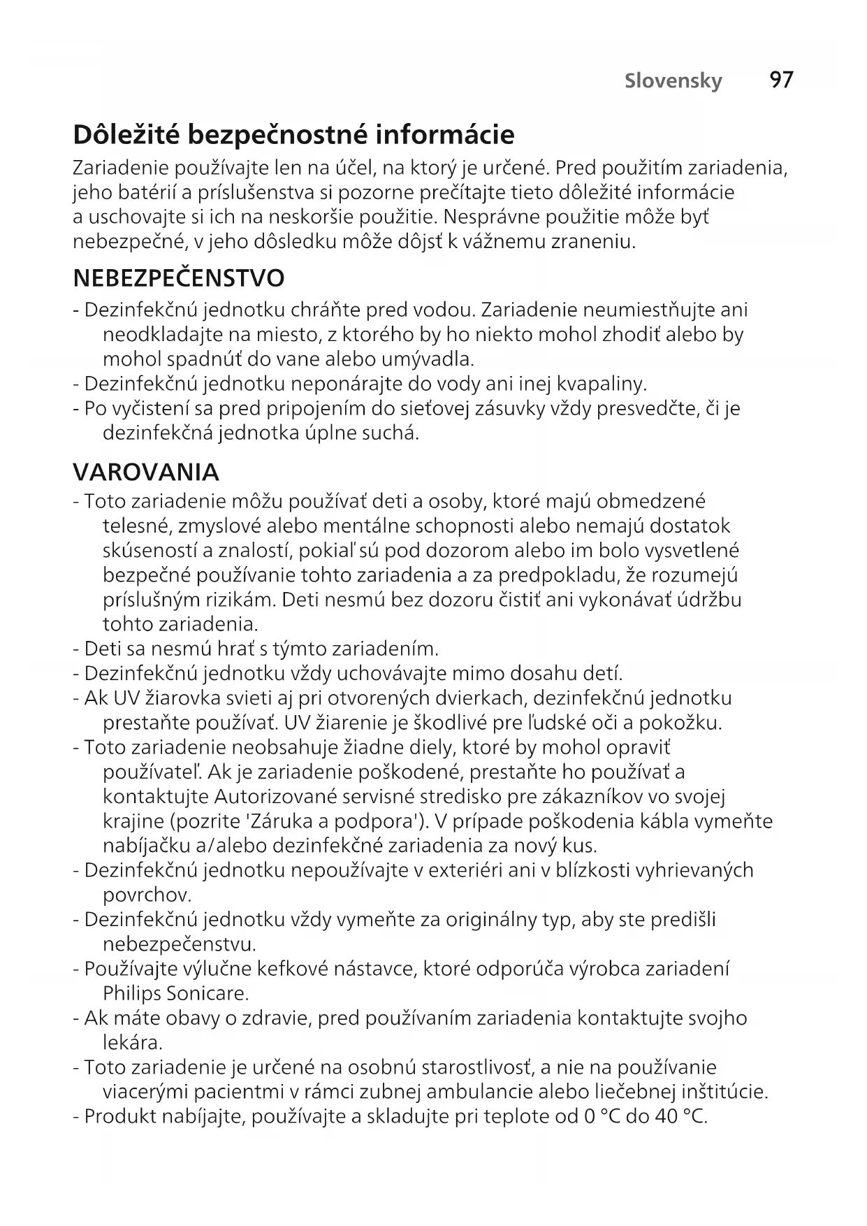 Slovensky Dôležité bezpečnostné informácie Zariadenie používajte len na účel, na ktorý je určené. Pred použitím zariadenia, jeho batérií a príslušenstva si pozorne prečítajte tieto dôležité informácie auschovajte si ich na neskoršie použitie. Nesprávne použitie môže byť nebezpečné, v jeho dôsledku môže dôjsť k vážnemu zraneniu. NEBEZPEČENSTVO - Dezinfekčnú jednotku chráňte pred vodou. Zariadenie neumiestňujte ani neodkladajte na miesto, zktorého by ho niekto mohol zhodiť alebo by mohol spadnúť do vane alebo umývadla. - Dezinfekčnú jednotku neponárajte do vody aniinej kvapaliny. - Po vyčistení sa pred pripojením do sieťovej zásuvky vždy presvedčte, či je dezinfekčná jednotka úplne suchá. VAROVANIA - Toto zariadenie môžu používať deti a osoby, ktoré majú obmedzené telesné, zmyslové alebo mentálne schopnosti alebo nemajú dostatok skúseností a znalostí, pokiaľ sú pod dozorom alebo im bolo vysvetlené bezpečné používanie tohto zariadenia a za predpokladu, že rozumejú príslušným rizikám. Deti nesmú bez dozoru čistiť ani vykonávať údržbu tohto zariadenia. - Deti sa nesmú hrať stýmto zariadením. - Dezinfekčnú jednotku vždy uchovávajte mimo dosahu detí. - Ak UV žiarovka svieti aj pri otvorených dvierkach, dezinfekčnú jednotku prestaňte používať. UV žiarenie je škodlivé pre ľudské oči a pokožku. - Toto zariadenie neobsahuje žiadne diely, ktoré by mohol opraviť používateľ. Ak je zariadenie poškodené, prestaňte ho používať a kontaktujte Autorizované servisné stredisko pre zákazníkov vo svojej krajine (pozrite 'Záruka apodpora'). V prípade poškodenia kábla vymeňte nabíjačku a/alebo dezinfekčné zariadenia za nový kus. - Dezinfekčnú jednotku nepoužívajte v exteriéri ani v blízkosti vyhrievaných povrchov. - Dezinfekčnú jednotku vždy vymeňte za originálny typ, aby ste predišli nebezpečenstvu. - Používajte výlučne kefkové nástavce, ktoré odporúča výrobca zariadení Philips Sonicare. - Ak máte obavy ozdravie, predpoužívaním zariadenia kontaktujte svojho lekára. - Toto zariadenie je určené naosobnú starostlivosť, a nie napoužívanie viacerými pacientmi vrámci zubnej ambulancie alebo liečebnej inštitúcie. - Produkt nabíjajte, používajte a skladujte pri teplote od 0°C do 40°C.98 Slovensky VÝSTRAHA - Dezinfekčné zariadenie používajte len s nasadenou ochrannou clonou. - Počas dezinfekčného cyklu a po jeho dokončení je UV žiarovka dezinfekčnej jednotky horúca. Keď je UV žiarovka horúca, nedotýkajte sa jej. - Ak ste použili dezinfekčnú jednotku v 3 po sebe nasledujúcich cykloch čistenia UV žiarením, pred ďalším čistiacim cyklom UV žiarením ju aspoň na 30 minút vypnite. - Žiadnu časť výrobku neumývajte v umývačke riadu. Elektromagnetické polia (EMF) Toto zariadenie značky Philips vyhovuje všetkým príslušným normám asmerniciam týkajúcim sa vystavenia elektromagnetickým poliam. Úvod Gratulujeme Vám k nákupu a vítame Vás medzi zákazníkmi spoločnosti Philips! Ak chcete využiť všetky výhody zákazníckej podpory spoločnosti Philips, zaregistrujte svoj výrobok na www.philips.com/welcome. Opis zariadenia (obr. 1) 1 Vypínač 2 Priehlbina na dvierkach 3 Okienko 4 Nabíjačka elektrickej zubnej kefky Sonicare 5 Kábel Dezinfekcia kefkových nástavcov Vďaka dezinfekčnej UV jednotke môžete kefkový nástavec očistiť po každom použití. Poznámka: UV žiarenie je škodlivé pre ľudské oči a pokožku.