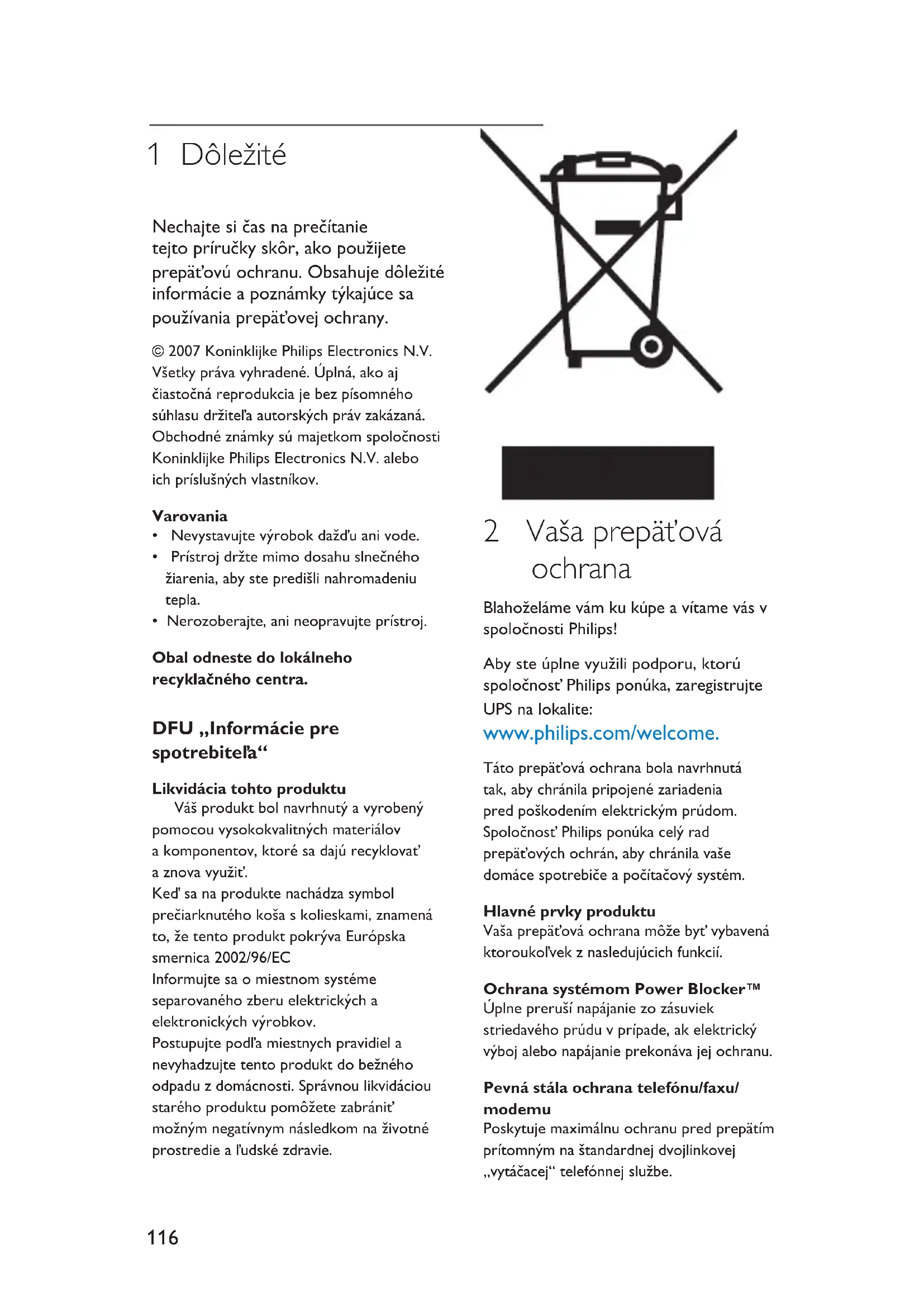 5 Záruka a servis 7116 1 Dôležité Nechajtesičasnaprečítanie tejtopríručkyskôr,akopoužijete prepäťovúochranu.Obsahujedôležité informácieapoznámkytýkajúcesa používaniaprepäťovejochrany. ©2007KoninklijkePhilipsElectronicsN.V. Všetkyprávavyhradené.Úplná,akoaj čiastočnáreprodukciajebezpísomného súhlasudržiteľaautorskýchprávzakázaná. Obchodnéznámkysúmajetkomspoločnosti KoninklijkePhilipsElectronicsN.V.alebo ichpríslušnýchvlastníkov. Varovania