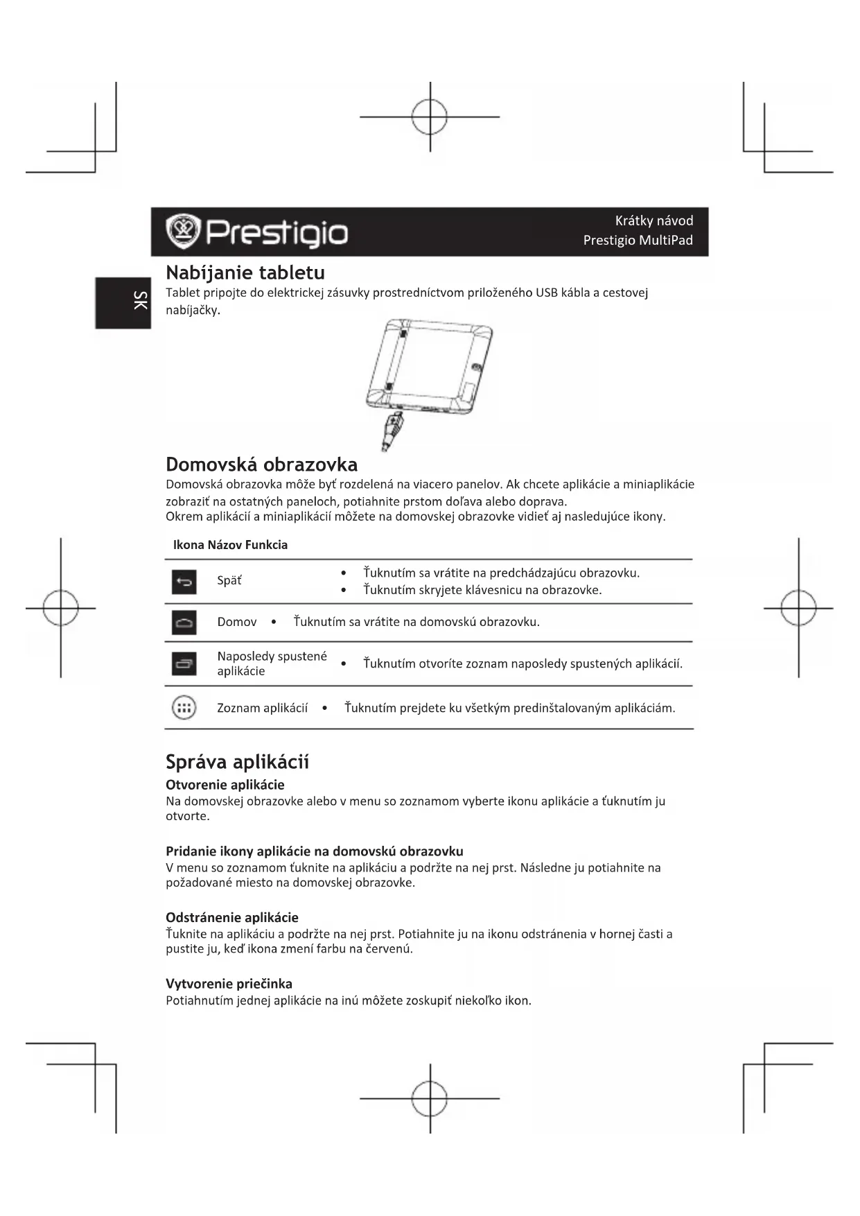 NanoSIM MicroSIM StandardSIM 3.Tabletzapnitepodržanímvypínača.SK Krátky návod Prestigio MultiPad Nabíjanie tabletu TabletpripojtedoelektrickejzásuvkyprostredníctvompriloženéhoUSBkáblaacestovej nabíjačky. Domovská obrazovka Domovskáobrazovkamôžebyťrozdelenánaviaceropanelov.Akchceteaplikácieaminiaplikácie zobraziťnaostatnýchpaneloch,potiahniteprstomdoľavaalebodoprava. Okremaplikáciíaminiaplikáciímôžetenadomovskejobrazovkevidieťajnasledujúceikony. Ikona Názov Funkcia Späť