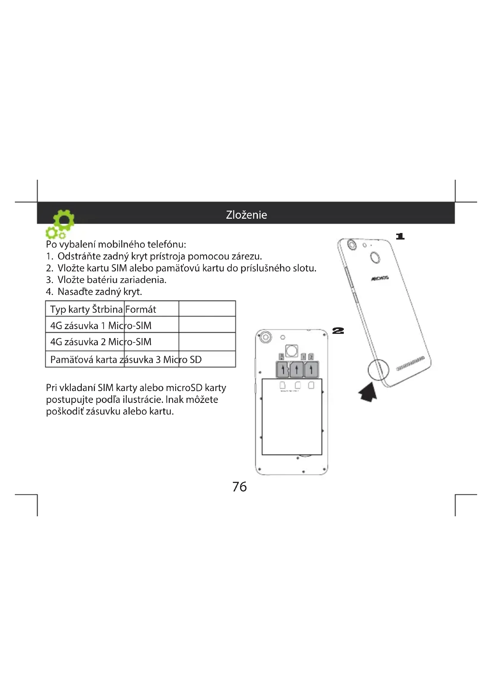 Typ karty Štrbina Formát 4G zásuvka 1 Micro-SIM 4G zásuvka 2 Micro-SIM Pamäťová karta zásuvka 3 Micro SD Pri vkladaní SIM karty alebo microSD karty postupujte podľa ilustrácie. Inak môžete poškodiť zásuvku alebo kartu. Zloženie