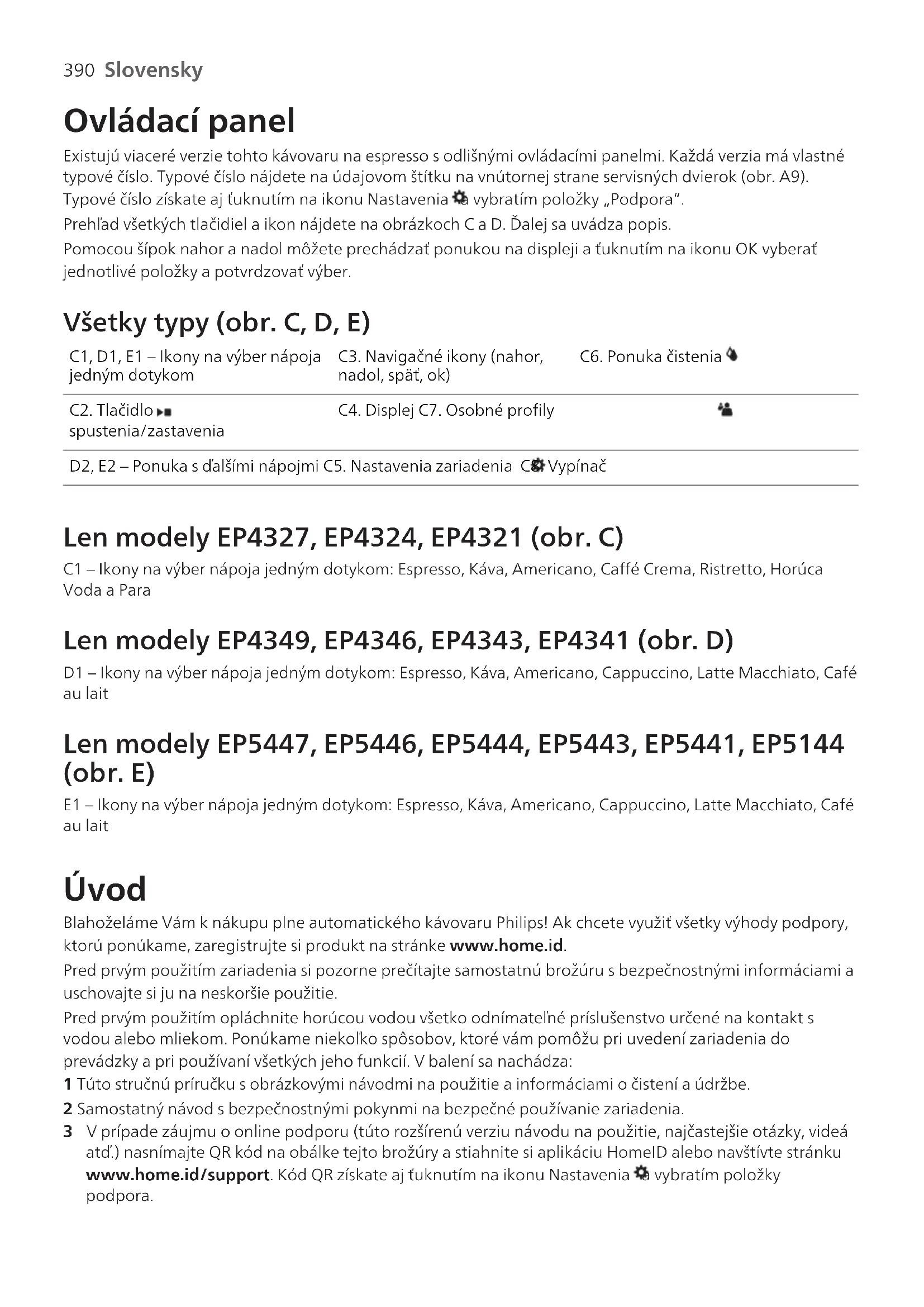 Slovensky SlovenskySlovensky Obsah Prehľad zariadenia (obr. A) _______________________________________________________________ 389Ovládací panel___________________________________________________________________________ 390Úvod ___________________________________________________________________________________ 390Pred prvým použitím_____________________________________________________________________ 391Príprava nápojov_________________________________________________________________________ 392Prispôsobenie nápojov ___________________________________________________________________ 394Úprava nastavení zariadenia______________________________________________________________ 395Vyberanie a vkladanie varnej zostavy _____________________________________________________ 396Čistenie aúdržba ________________________________________________________________________ 397 Vodný filter AquaClean __________________________________________________________________ 400 Proces odstraňovania vodného kameňa (30 minút) ________________________________________ 401Objednávanie príslušenstva ______________________________________________________________ 402Riešenie problémov ______________________________________________________________________ 402Technické parametre _____________________________________________________________________ 408 Prehľad zariadenia (obr. A) A1 Ovládací panel A10 Údajový štítok s typovým číslomA2 Odkladacia plocha na šálky A11 Zásobník na voduA3 Priestor na predmletú kávu A12 Výpust horúcej vodyA4 Veko násypky na kávové zrná A13 Zásobník na pomletú kávuA5 Nastaviteľný výpust na kávu A14 Predný panel zásobníka na pomletú kávuA6 Regulátor nastavenia mletia A15 Kryt podnosu na odkvapkávanieA7 Násypka na kávové zrná A16 Podnos na odkvapkávanieA8 Varná zostava A17 Indikátor „Plný podnos naodkvapkávanie“A9 Servisné dvierka Príslušenstvo A18 Vodný filter AquaClean A21 Klasický penič mlieka (len určité modely)A19 Odmerka A22 LatteGo (zásobník na mlieko) (len určitémodely)A20 Prúžok na testovanie tvrdosti vody390 Slovensky Ovládací panel Existujú viaceré verzie tohto kávovaru na espresso sodlišnými ovládacími panelmi. Každá verzia má vlastné typové číslo. Typové číslo nájdete na údajovom štítku na vnútornej strane servisných dvierok (obr.A9). Typové číslo získate aj ťuknutím na ikonu Nastavenia a vybratím položky „Podpora“. Prehľad všetkých tlačidiel aikon nájdete na obrázkoch C aD. Ďalej sa uvádza popis. Pomocou šípok nahor anadol môžete prechádzať ponukou na displeji aťuknutím na ikonu OK vyberať jednotlivé položky apotvrdzovať výber. Všetky typy (obr. C, D, E) C1, D1, E1 – Ikony na výber nápoja jedným dotykom C3. Navigačné ikony (nahor, nadol, späť, ok) C6. Ponuka čistenia C2. Tlačidlo spustenia/zastavenia C4. Displej C7. Osobné profily D2, E2 – Ponuka s ďalšími nápojmi C5. Nastavenia zariadenia C8. Vypínač Len modely EP4327, EP4324, EP4321 (obr. C) C1 – Ikony na výber nápoja jedným dotykom: Espresso, Káva, Americano, Caffé Crema, Ristretto, Horúca Voda a Para Len modely EP4349, EP4346, EP4343, EP4341 (obr. D) D1 – Ikony na výber nápoja jedným dotykom: Espresso, Káva, Americano, Cappuccino, Latte Macchiato, Café au lait Len modely EP5447, EP5446, EP5444, EP5443, EP5441, EP5144 (obr. E) E1 – Ikony na výber nápoja jedným dotykom: Espresso, Káva, Americano, Cappuccino, Latte Macchiato, Café au lait Úvod Blahoželáme Vám k nákupu plne automatického kávovaru Philips! Ak chcete využiť všetky výhody podpory, ktorú ponúkame, zaregistrujte si produkt na stránke www.home.id. Pred prvým použitím zariadenia si pozorne prečítajte samostatnú brožúru s bezpečnostnými informáciami a uschovajte si ju na neskoršie použitie. Pred prvým použitím opláchnite horúcou vodou všetko odnímateľné príslušenstvo určené na kontakt s vodou alebo mliekom. Ponúkame niekoľko spôsobov, ktoré vám pomôžu pri uvedení zariadenia do prevádzky apri používaní všetkých jeho funkcií. Vbalení sa nachádza: 1 Túto stručnú príručku sobrázkovými návodmi na použitie ainformáciami očistení aúdržbe. 2 Samostatný návod sbezpečnostnými pokynmi na bezpečné používanie zariadenia. 3 Vprípade záujmu oonline podporu (túto rozšírenú verziu návodu na použitie, najčastejšie otázky, videá atď.) nasnímajte QR kód na obálke tejto brožúry astiahnite si aplikáciu HomeID alebo navštívte stránku www.home.id/support. Kód QR získate aj ťuknutím na ikonu Nastavenia avybratím položky podpora.391 Slovensky Slovensky Toto zariadenie bolo preskúšané na príprave kávy. Napriek tomu, že bolo dôkladne prečistené, môžu sa vňom nachádzať zvyšky kávy. Ručíme vám však za to, že je úplne nové. Zariadenie automaticky upravuje množstvo mletej kávy potrebné na prípravu tej najchutnejšie kávy. Najprv treba pripraviť 5 šálok kávy, aby sa zariadenie samo nastavilo. Pred prvým použitím nezabudnite prepláchnuť jednotku LatteGo (zásobník na mlieko) alebo klasický napeňovač mlieka. Pred prvým použitím