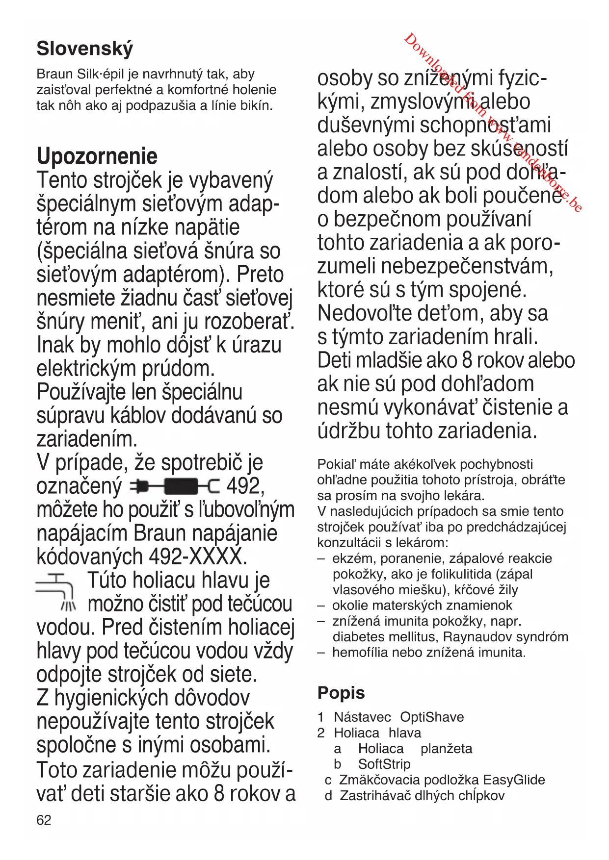 - Vždy dbajte na to, aby obidva diely, holiaca planžeta aj zastrihávač dlhých chĺpkov, boli v kontakte s pokožkou. Holenie nôh s použitím peelingového nástavca Miesto nástavca OptiShave môžete použiť peelingový nástavec (6), ktorý pomáha 91094868_LS_5560_S6-104.indd 6391094868_LS_5560_S6-104.indd 63 27.09.16 13:3627.09.16 13:36 CSS APPROVED Effective Date 4Oct2016 GMT - Printed 04Jan2017 Page 62 of 103 Downloaded from www.vandenborre.be64 zlepšovať celkový vzhľad pokožky vďaka svojej peelingovej doštičke. Táto peelingová doštička jemne obrusuje pokožku, a tak odstraňuje odumreté bunky na jej povrchu, čím sa pokožka revitalizuje a získava žiarivý vzhľad. Postupujte následovne: – Snímte nástavec OptiShave (1) a nahraďte ho peelingovým nástavcom (6). – Keď vediete strojček pomaly proti smeru rastu chĺpkov, vždy sa uistite, že zastrihávač dlhých chĺpkov, holiaca planžeta a peelingová doštička sú v kontaktu s pokožkou. Holenie a úprava podpazušia a oblasti bikín U týchto citlivých partií vždy dbajte na to, aby ste pri holení pokožku napli, predídete tak prípadným poraneniam (B). Obzvlášť buďte prosím opatrní, ak je povrch poko- žky nerovný, na koži sú výrastky apod. Nedotýkajte sa ich zastrihávačom dlhých chĺpkov. Holenie podpazušia a oblasti bikín: Snímte nástavec OptiShave pre optimálny dosah. Pri holení vždy držte pokožku napnutú. Úprava oblasti bikín: Pre zastrihnutie presných línií a kontúr zaistite zastrihávač dlhých chĺpkov posunutím prepínača TrimLock do polohy (C1). Pre zastrihnutie chĺpkov na jednotnú dĺžku, zafixujte zastrihávač dlhých chĺpkov a nadstavec OptiTrim pre zastrihávanie chĺpkov v oblasti bikín (7) umiestnite na holiacu hlavu. (C2). Aby ste dosiahli optimálnych výsledkov, pohybujte strojčekom pomaly proti smeru rastu chĺpkov. Po skončení holenia Po skončení holenia môžete použiť malé množstvo telového mlieka alebo krému. Vyvarujte sa však bezprostrednému používaniu dráždivých substancií, ako napr. dezodorantov obsahujúcich alkohol. Čistenie Čistenie holiacej hlavy kefkou (D1)