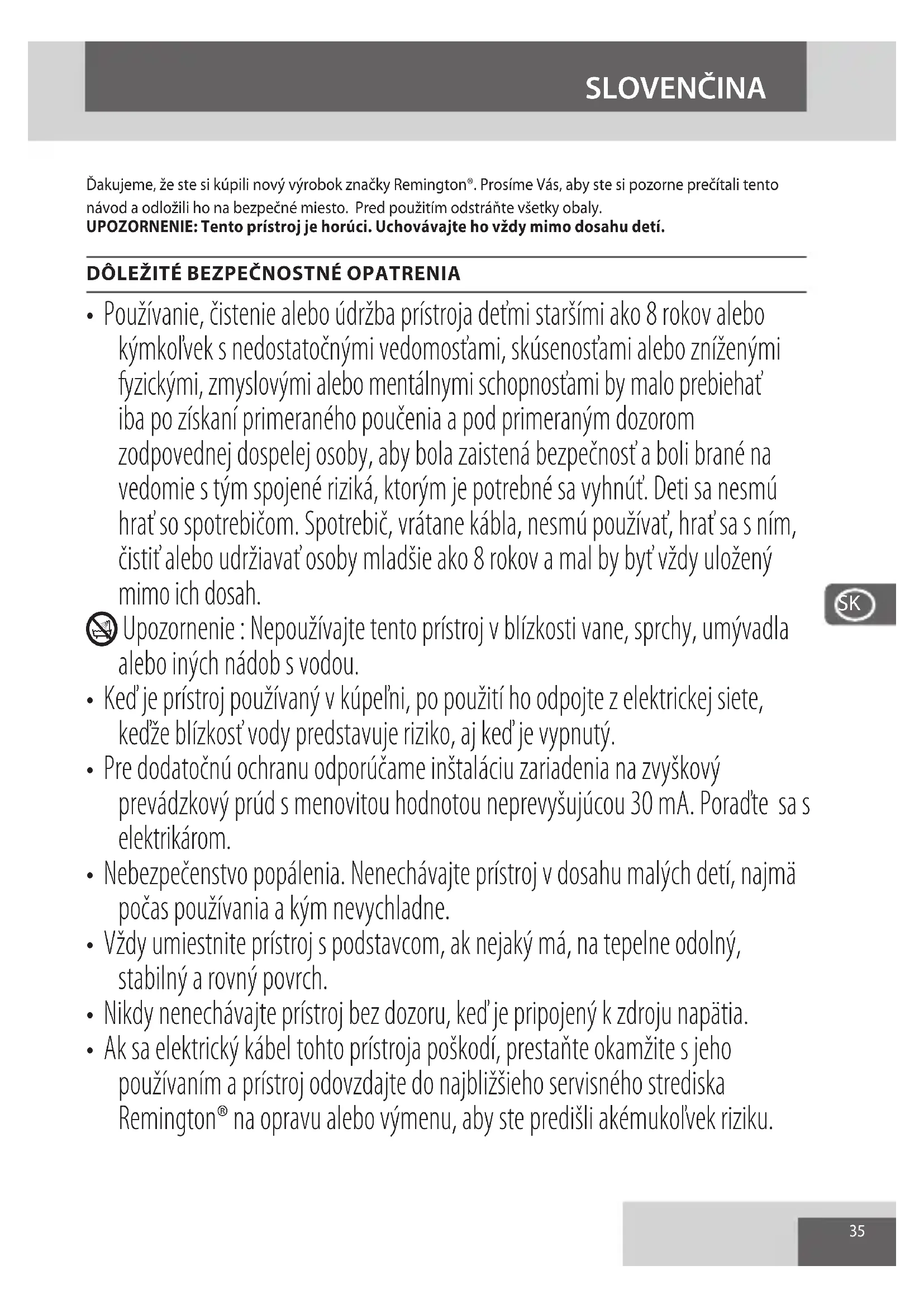 - Ak sa elektrický kábel tohto prístroja poškodí, prestaňte okamžite s jeho používaním a prístroj odovzdajte do najbližšieho servisného strediska Remington® na opravu alebo výmenu, aby ste predišli akémukoľvek riziku.36 SLOVENČINA