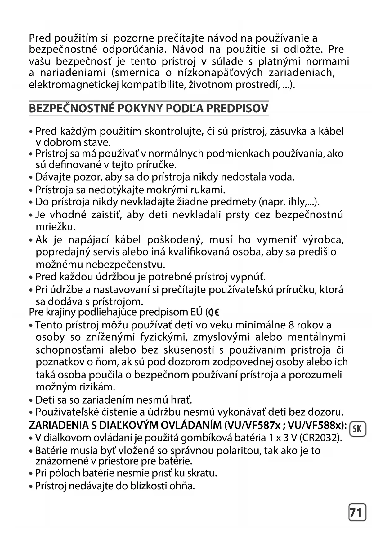 - Používateľské čistenie a údržbu nesmú vykonávať deti bez dozoru. ZARIADENIA S DIAĽKOVÝM OVLÁDANÍM (VU/VF587x ; VU/VF588x):