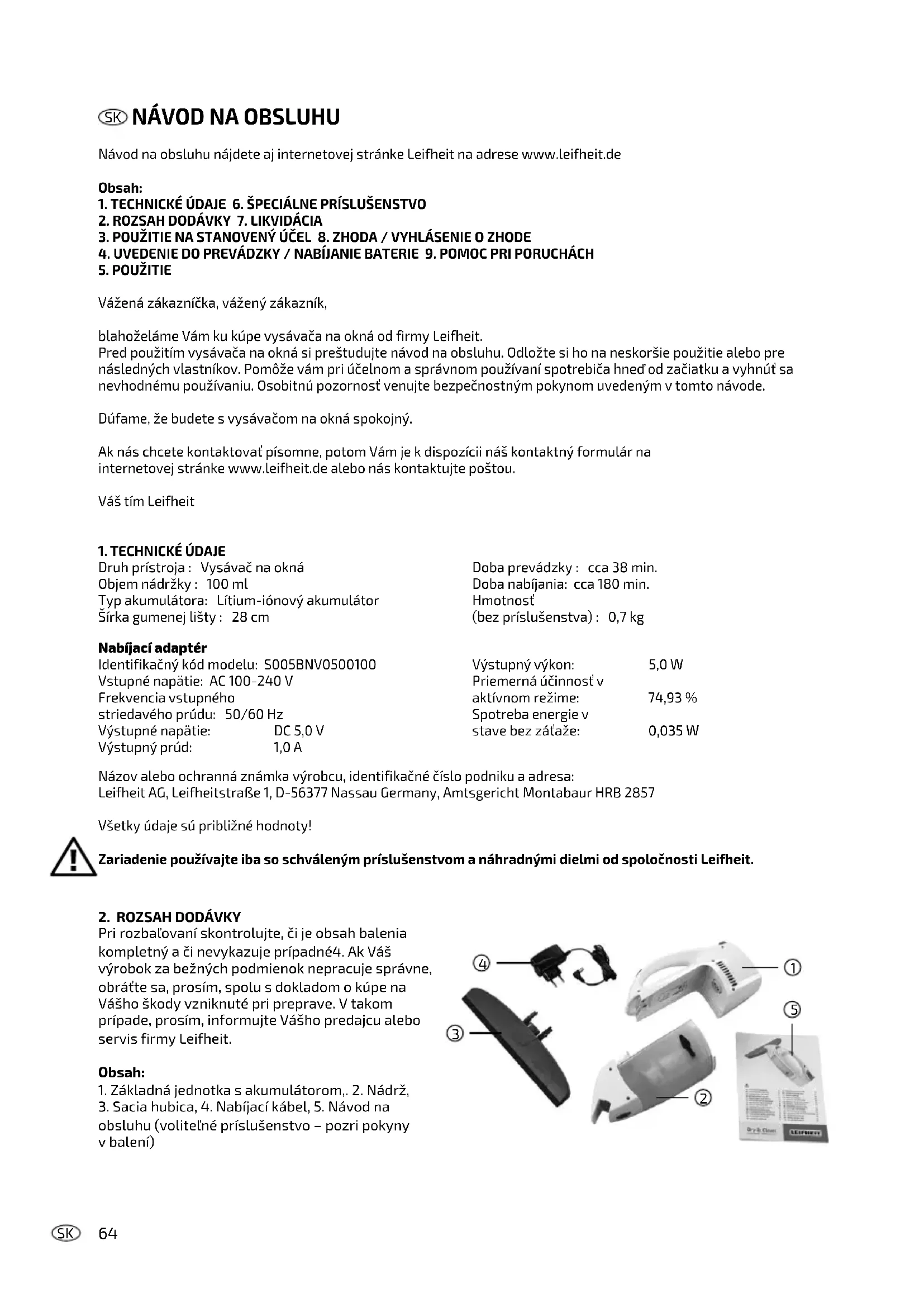 Druh prístroja : Vysávač na okná Objem nádržky : 100 ml Typ akumulátora: Lítium-iónový akumulátor Šírka gumenej lišty : 28 cm Doba prevádzky : cca 38 min. Doba nabíjania: cca 180 min. Hmotnosť (bez príslušenstva) : 0,7 kg Názov alebo ochranná známka výrobcu, identifikačné číslo podniku a adresa: Leifheit AG, Leifheitstraße 1, D-56377 Nassau Germany, Amtsgericht Montabaur HRB 2857 Všetky údaje sú približné hodnoty! Zariadenie používajte iba so schváleným príslušenstvom a náhradnými dielmi od spoločnosti Leifheit. Nabíjací adaptér Identifikačný kód modelu: S005BNV0500100 Vstupné napätie: AC 100-240 V Frekvencia vstupného striedavého prúdu: 50/60 Hz Výstupné napätie: DC 5,0 V Výstupný prúd: 1,0 A Výstupný výkon: 5,0 W Priemerná účinnosť v aktívnom režime: 74,93 % Spotreba energie v stave bez záťaže: 0,035 W65