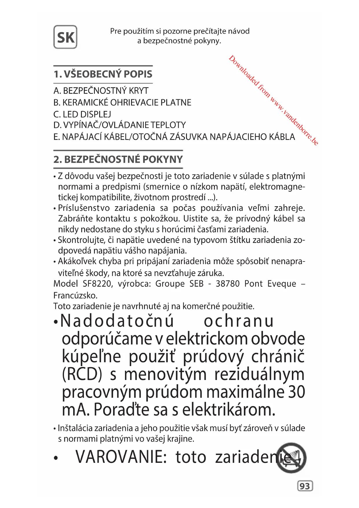 - Ak je napájací kábel poškodený, Downloaded from www.vandenborre.be95 musí ho nahradiť výrobca, jeho servisný zástupca alebo podobne kvalikované osoby, aby sa pre- dišlo ohrozeniu.