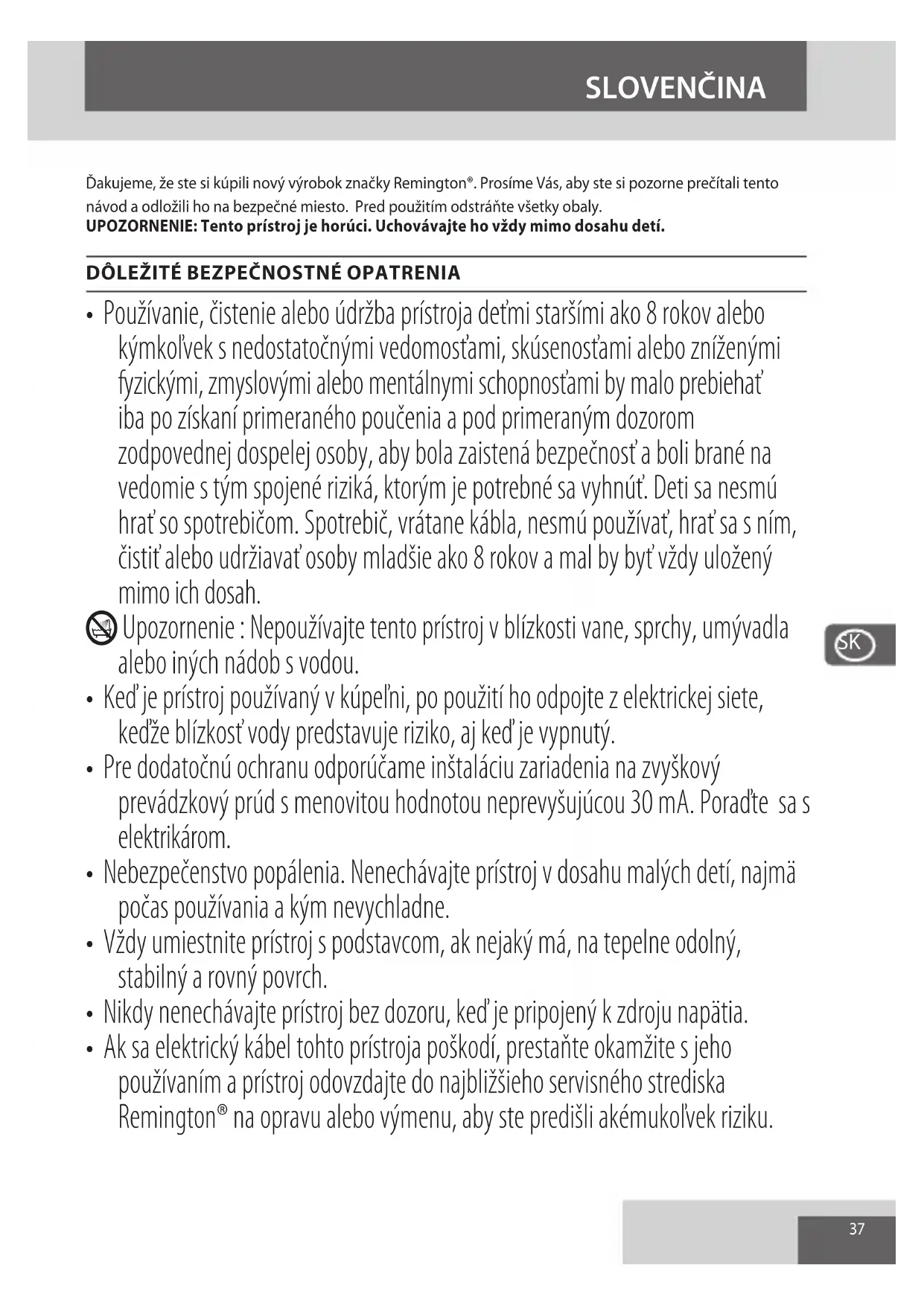- Ak sa elektrický kábel tohto prístroja poškodí, prestaňte okamžite s jeho používaním a prístroj odovzdajte do najbližšieho servisného strediska Remington® na opravu alebo výmenu, aby ste predišli akémukoľvek riziku.