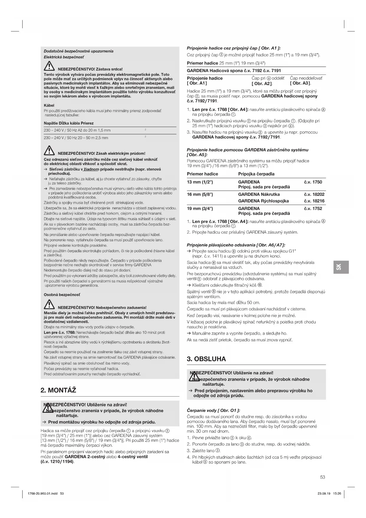 NEBEZPEČENSTVO! Zásah elektrickým prúdom! Cez odrezanú sieťovú zástrčku môže cez sieťový kábel vniknúť do elektrickej oblasti vlhkosť a spôsobiť skrat. v Sieťovú zástrčku v žiadnom prípade nestrihajte (napr. stenová priechodka). v Neťahajte zástrčku za kábel, aj ju chcete vytiahnuť zo zásuvky, chyťte ju za teleso zástrčky. v Pre zamedzenie nebezpečenstva musí výmenu sieťo vého kábla tohto prístroja v prípade jeho poškodenia urobiť výrobca alebo jeho zákaznícky servis alebo podobná kvalifikovaná osoba. Zástrčky a spojky musia byť chránené proti striekajúcej vode. Ubezpečte sa, že sa elektrické pripojenie nenachádza v oblasti zaplavenej vodou. Zástrčku a sieťový kábel chráňte pred horkom, olejom a ostrými hranami. Dbajte na sieťové napätie. Údaje na typovom štítku musia súhlasiť s údajmi v sieti. Ak sa v plaveckom bazéne nachádzajú osoby, musí sa zástrčka čerpadla bez- podmienečne vytiahnuť zo siete. Na prenášanie alebo upevňovanie čerpadla nepoužívajte napájací kábel. Na ponorenie resp. vytiahnutie čerpadla sa musí použiť upevňovacie lano. Prípojné vedenie kontrolujte pravidelne. Pred použitím čerpadla skontrolujte pohľadom, či nie je poškodené (hlavne kábel a zástrčku). Poškodené čerpadlo nikdy nepoužívajte. Čerpadlo v prípade poškodenia bezpodmie nečne nechajte skontrolovať v servise firmy GARDENA Nedemontujte čerpadlo ďalej než do stavu pri dodaní. Pred použitím po vykonaní údržby zabezpečte, aby boli zoskrutkované všetky diely. Pri použití našich čerpadiel s generátormi sa musia rešpektovať výstražné upozornenia výrobcu generátora. Osobná bezpečnosť NEBEZPEČENSTVO! Nebezpečenstvo zadusenia! Menšie diely je možné ľahko prehltnúť. Obaly z umelých hmôt predstavu- jú pre malé deti nebezpečenstvo zadusenia. Pri montáži držte malé deti v dostatočnej vzdialenosti. Dbajte na minimálny stav vody podľa údajov očerpadle. Len pre č.v. 1768: Nenechávajte čerpadlo bežať dlhšie ako 10 minút proti uzatvorenej výtlačnej strane. Piesok a iné abrazívne látky vedú k rýchlejšiemu opotrebeniu a skráteniu život- nosti čerpadla. Čerpadlo sa nesmie používať na zosilnenie tlaku cez závit vstupnej strany. Na závit vstupnej strany sa smie namontovať iba GARDENA plávajúce odsávanie. Plavákový spínač sa smie obsluhovať iba mimo vody. Počas prevádzky sa nesmie vyťahovať hadica. Pred odstraňovaním poruchy nechajte čerpadlo vychladnúť.