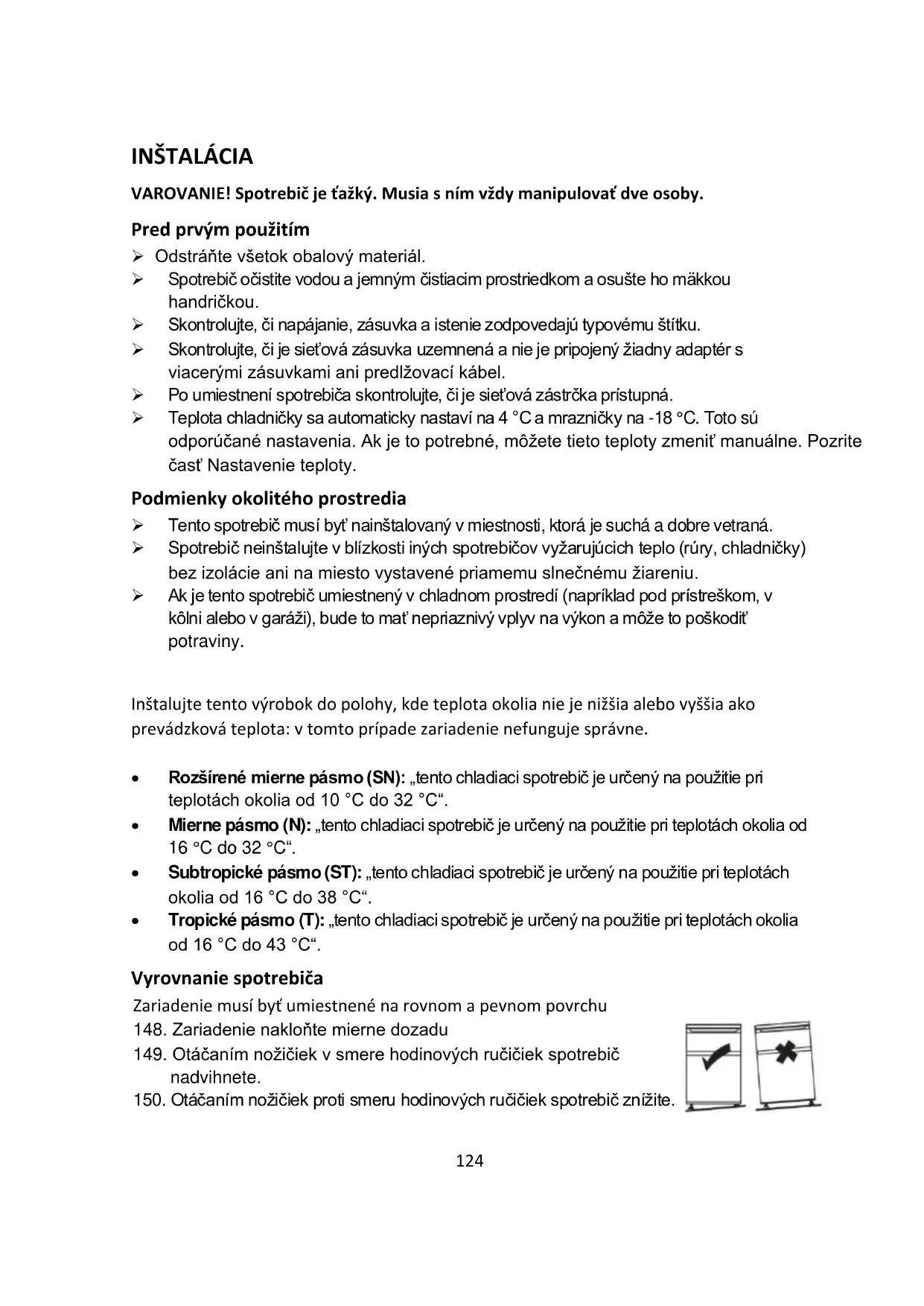 - Tropické pásmo (T): „tento chladiaci spotrebič je určený na použitie pri teplotách okolia od 16 °C do 43 °C“. Vyrovnanie spotrebiča Zariadenie musí byť umiestnené na rovnom a pevnom povrchu