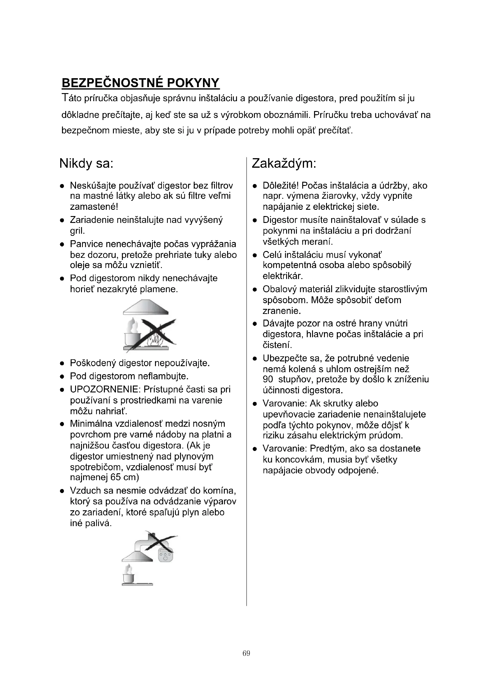 Táto príručka objasňuje správnu inštaláciu a používanie digestora, pred použitím si ju dôkladne prečítajte, aj keď ste sa už s výrobkom oboznámili. Príručku treba uchovávať na bezpečnom mieste, aby ste si ju v prípade potreby mohli opäť prečítať. Nikdy sa: ● Neskúšajte používať digestor bez filtrov na mastné látky alebo ak sú filtre veľmi zamastené! ● Zariadenie neinštalujte nad vyvýšený gril. ● Panvice nenechávajte počas vyprážania bez dozoru, pretože prehriate tuky alebo oleje sa môžu vznietiť. ● Pod digestorom nikdy nenechávajte horieť nezakryté plamene. ● Poškodený digestor nepoužívajte. ● Pod digestorom neflambujte. ● UPOZORNENIE: Prístupné časti sa pri používaní s prostriedkami na varenie môžu nahriať. ● Minimálna vzdialenosť medzi nosným povrchom pre varné nádoby na platni a najnižšou časťou digestora. (Ak je digestor umiestnený nad plynovým spotrebičom, vzdialenosť musí byť najmenej 65 cm) ● Vzduch sa nesmie odvádzať do komína, ktorý sa používa na odvádzanie výparov zo zariadení, ktoré spaľujú plyn alebo iné palivá. Zakaždým: ● Dôležité! Počas inštalácia a údržby, ako napr. výmena žiarovky, vždy vypnite napájanie z elektrickej siete. ● Digestor musíte nainštalovať v súlade s pokynmi na inštaláciu a pri dodržaní všetkých meraní. ● Celú inštaláciu musí vykonať kompetentná osoba alebo spôsobilý elektrikár. ● Obalový materiál zlikvidujte starostlivým spôsobom. Môže spôsobiť deťom zranenie. ● Dávajte pozor na ostré hrany vnútri digestora, hlavne počas inštalácie a pri čistení. ● Ubezpečte sa, že potrubné vedenie nemá kolená s uhlom ostrejším než 90 stupňov, pretože by došlo k zníženiu účinnosti digestora. ● Varovanie: Ak skrutky alebo upevňovacie zariadenie nenainštalujete podľa týchto pokynov, môže dôjsť k riziku zásahu elektrickým prúdom. ● Varovanie: Predtým, ako sa dostanete ku koncovkám, musia byť všetky napájacie obvody odpojené.