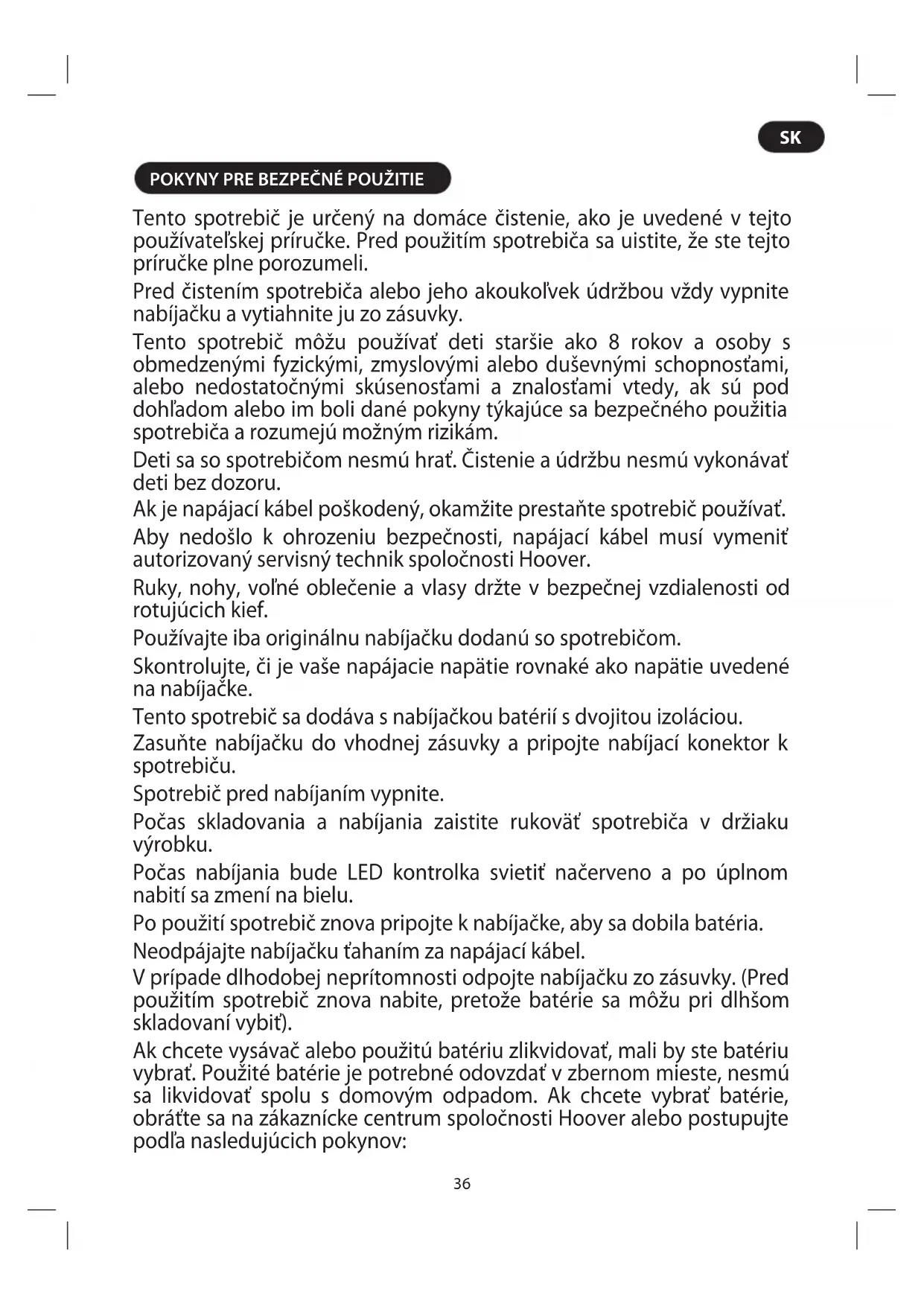 Tento spotrebič je určený na domáce čistenie, ako je uvedené v tejto používateľskej príručke. Pred použitím spotrebiča sa uistite, že ste tejto príručke plne porozumeli. Pred čistením spotrebiča alebo jeho akoukoľvek údržbou vždy vypnite nabíjačku a vytiahnite ju zo zásuvky. Tento spotrebič môžu používať deti staršie ako 8 rokov a osoby s obmedzenými fyzickými, zmyslovými alebo duševnými schopnosťami, alebo nedostatočnými skúsenosťami a znalosťami vtedy, ak sú pod dohľadom alebo im boli dané pokyny týkajúce sa bezpečného použitia spotrebiča a rozumejú možným rizikám. Deti sa so spotrebičom nesmú hrať. Čistenie a údržbu nesmú vykonávať deti bez dozoru. Ak je napájací kábel poškodený, okamžite prestaňte spotrebič používať. Aby nedošlo k ohrozeniu bezpečnosti, napájací kábel musí vymeniť autorizovaný servisný technik spoločnosti Hoover. Ruky, nohy, voľné oblečenie a vlasy držte v bezpečnej vzdialenosti od rotujúcich kief. Používajte iba originálnu nabíjačku dodanú so spotrebičom. Skontrolujte, či je vaše napájacie napätie rovnaké ako napätie uvedené na nabíjačke. Tento spotrebič sa dodáva s nabíjačkou batérií s dvojitou izoláciou. Zasuňte nabíjačku do vhodnej zásuvky a pripojte nabíjací konektor k spotrebiču. Spotrebič pred nabíjaním vypnite. Počas skladovania a nabíjania zaistite rukoväť spotrebiča v držiaku výrobku. Počas nabíjania bude LED kontrolka svietiť načerveno a po úplnom nabití sa zmení na bielu. Po použití spotrebič znova pripojte k nabíjačke, aby sa dobila batéria. Neodpájajte nabíjačku ťahaním za napájací kábel. V prípade dlhodobej neprítomnosti odpojte nabíjačku zo zásuvky. (Pred použitím spotrebič znova nabite, pretože batérie sa môžu pri dlhšom skladovaní vybiť). Ak chcete vysávač alebo použitú batériu zlikvidovať, mali by ste batériu vybrať. Použité batérie je potrebné odovzdať v zbernom mieste, nesmú sa likvidovať spolu s domovým odpadom. Ak chcete vybrať batérie, obráťte sa na zákaznícke centrum spoločnosti Hoover alebo postupujte podľa nasledujúcich pokynov:37 POZNÁMKA: Ak máte ťažkosti s demontážou zariadenia alebo ak potrebujete podrobnejšie informácie o spracovaní, zhodnotení a recyklácii tohto spotrebiča, kontaktujte miestny úrad alebo službu likvidácie domáceho odpadu. DÔLEŽITÉ: Pred vybratím batérie vždy úplne vybite a uistite sa, že je nabíjačka odpojená. Likvidácia batérie na konci životnosti výrobku Bezpečne zlikvidujte batérie.