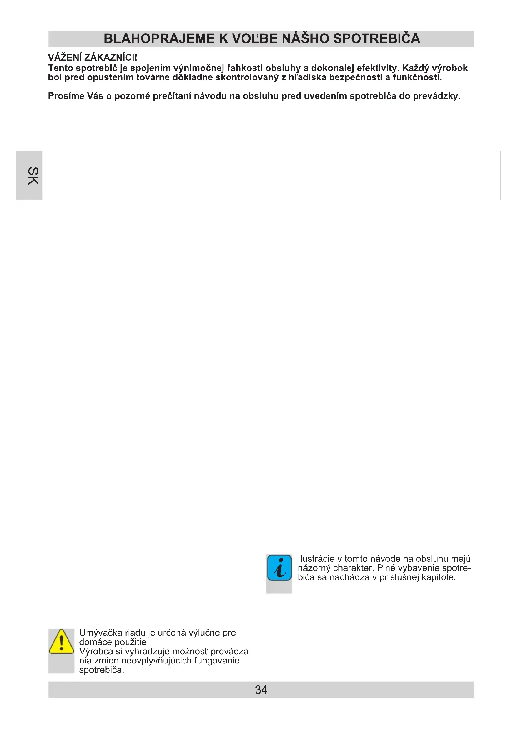 Umývačka riadu je určená výlučne pre domáce použitie. Výrobca si vyhradzuje možnosť prevádza- nia zmien neovplyvňujúcich fungovanie spotrebiča. SK35