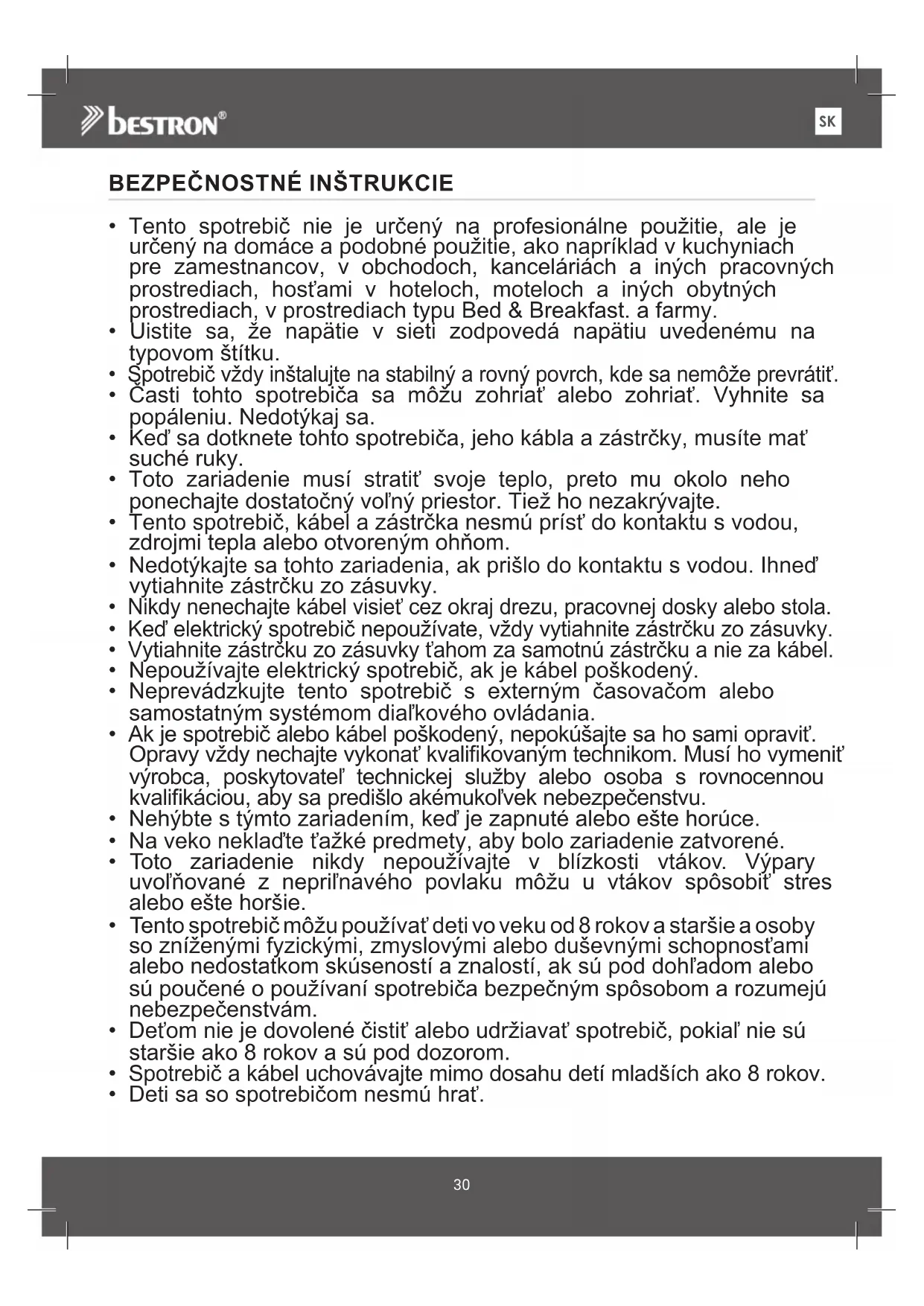 - Tento spotrebič, kábel a zástrčka nesmú prísť do kontaktu s vodou, zdrojmi tepla alebo otvoreným ohňom.