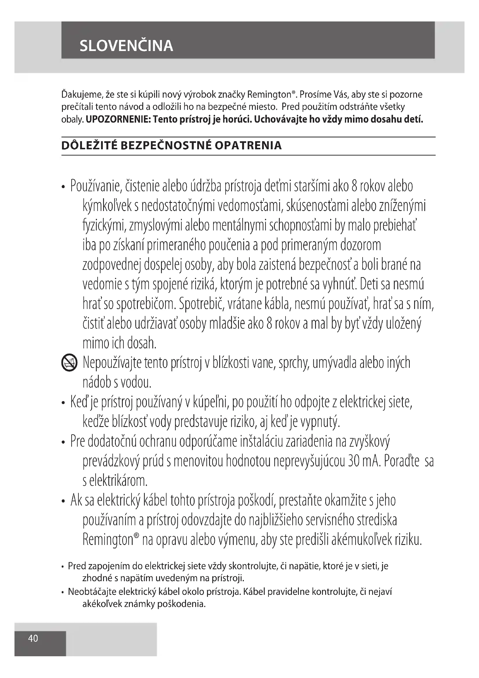 - Ak sa elektrický kábel tohto prístroja poškodí, prestaňte okamžite s jeho používaním a prístroj odovzdajte do najbližšieho servisného strediska Remington® na opravu alebo výmenu, aby ste predišli akémukoľvek riziku.