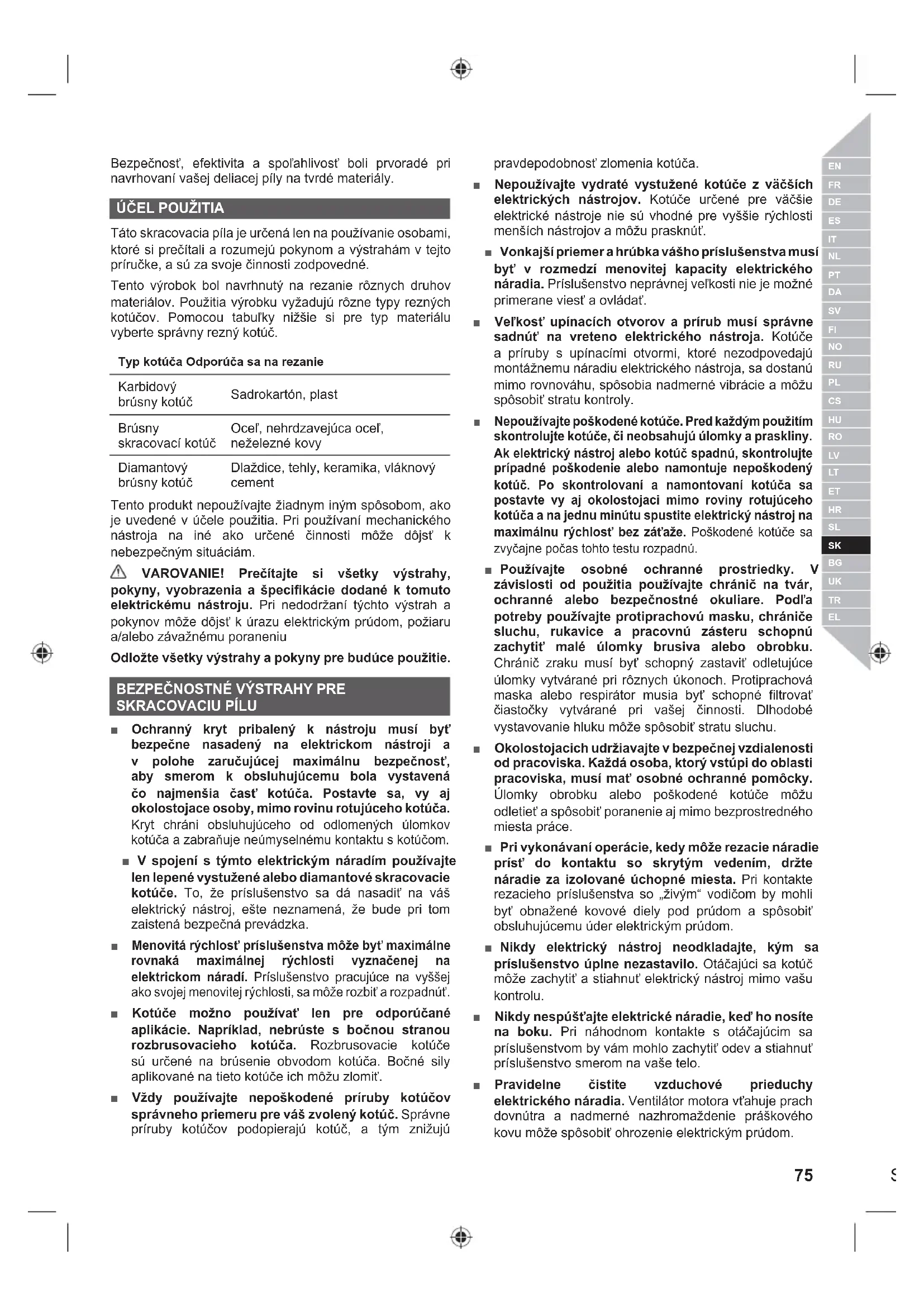 Táto skracovacia píla je určená len na používanie osobami, ktoré si prečítali a rozumejú pokynom a výstrahám v tejto príručke, a sú za svoje činnosti zodpovedné. Tento výrobok bol navrhnutý na rezanie rôznych druhov materiálov. Použitia výrobku vyžadujú rôzne typy rezných kotúčov. Pomocou tabuľky nižšie si pre typ materiálu vyberte správny rezný kotúč. Typ kotúča Odporúča sa na rezanie Karbidový brúsny kotúč Sadrokartón, plast Brúsny skracovací kotúč Oceľ, nehrdzavejúca oceľ, neželezné kovy Diamantový brúsny kotúč Dlaždice, tehly, keramika, vláknový cement Tento produkt nepoužívajte žiadnym iným spôsobom, ako je uvedené v účele použitia. Pri používaní mechanického nástroja na iné ako určené činnosti môže dôjsť k nebezpečným situáciám. VAROVANIE! Prečítajte si všetky výstrahy, pokyny, vyobrazenia a špecifikácie dodané k tomuto elektrickému nástroju. Pri nedodržaní týchto výstrah a pokynov môže dôjsť k úrazu elektrickým prúdom, požiaru a/alebo závažnému poraneniu Odložte všetky výstrahy a pokyny pre budúce použitie.
