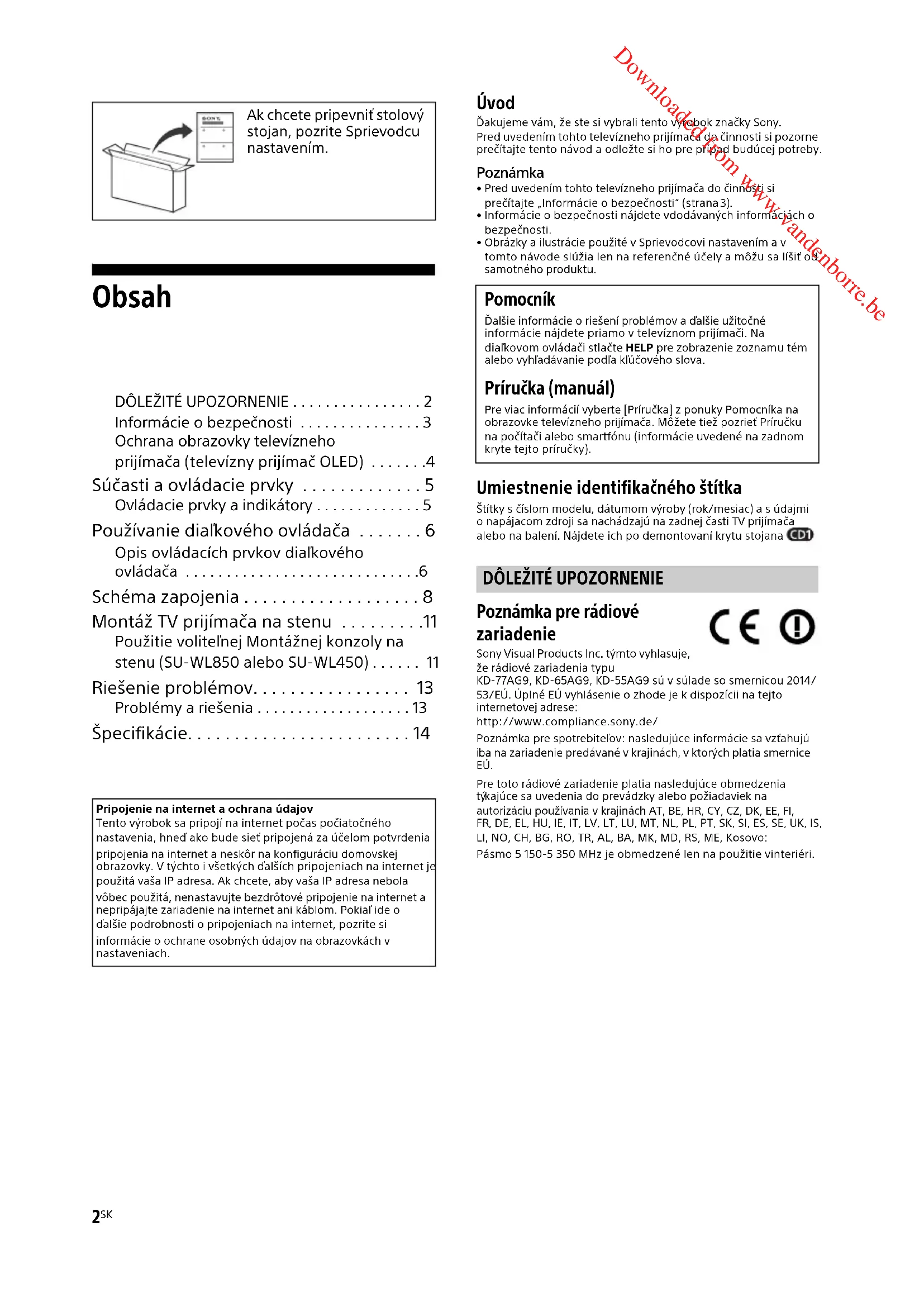 - Pred uvedením tohto televízneho prijímača do činnosti si prečítajte „Informácie o bezpečnosti“ (strana 3). • Informácie o bezpečnosti nájdete vdodávaných informáciách o bezpečnosti.• Obrázky a ilustrácie použité v Sprievodcovi nastavením a v tomto návode slúžia len na referenčné účely a môžu sa líšiť od samotného produktu. Umiestnenie identifikačného štítka Štítky s číslom modelu, dátumom výroby (rok/mesiac) a s údajmi o napájacom zdroji sa nachádzajú na zadnej časti TV prijímača alebo na balení. Nájdete ich po demontovaní krytu stojana . Poznámka pre rádiové zariadenie Sony Visual Products Inc. týmto vyhlasuje, že rádiové zariadenia typu KD-77AG9, KD-65AG9, KD-55AG9 sú v súlade so smernicou 2014/ /EÚ. Úplné EÚ vyhlásenie o zhode je k dispozícii na tejto internetovej adrese: http://www.compliance.sony.de/Poznámka pre spotrebiteľov: nasledujúce informácie sa vzťahujú ba na zariadenie predávané v krajinách, v ktorých platia smernice EÚ. Pre toto rádiové zariadenie platia nasledujúce obmedzenia kajúce sa uvedenia do prevádzky alebo požiadaviek naautorizáciu používania v krajinách AT, BE, HR, CY, CZ, DK, EE, FI, , DE, EL, HU, IE, IT, LV, LT, LU, MT, NL, PL, PT, SK, SI, ES, SE, UK, IS, LI, NO, CH, BG, RO, TR, AL, BA, MK, MD, RS, ME, Kosovo:Pásmo 5 150-5 350 MHz je obmedzené len na použitie vinteriéri.Ak chcete pripevniť stolový stojan, pozrite Sprievodcu stavením.Pripojenie na internet a ochrana údajovTento výrobok sa pripojí na internet počas počiatočného nastavenia, hneď ako bude sieť pripojená za účelom potvrdenia pripojenia na internet a neskôr na konfiguráciu domovskej obrazovky. V týchto i všetkých ďalších pripojeniach na internet je použitá vaša IP adresa. Ak chcete, aby vaša IP adresa nebola vôbec použitá, nenastavujte bezdrôtové pripojenie na internet a nepripájajte zariadenie na internet ani káblom. Pokiaľ ide o ďalšie podrobnosti o pripojeniach na internet, pozrite si informácie o ochrane osobných údajov na obrazovkách v nastaveniach. Pomocník Ďalšie informácie o riešení problémov a ďalšie užitočné informácie nájdete priamo v televíznom prijímači. Na diaľkovom ovládači stlačte HELP pre zobrazenie zoznamu tém alebo vyhľadávanie podľa kľúčového slova. Príručka (manuál) Pre viac informácií vyberte [Príručka] z ponuky Pomocníka na obrazovke televízneho prijímača. Môžete tiež pozrieť Príručku na počítači alebo smartfónu (informácie uvedené na zadnom kryte tejto príručky).