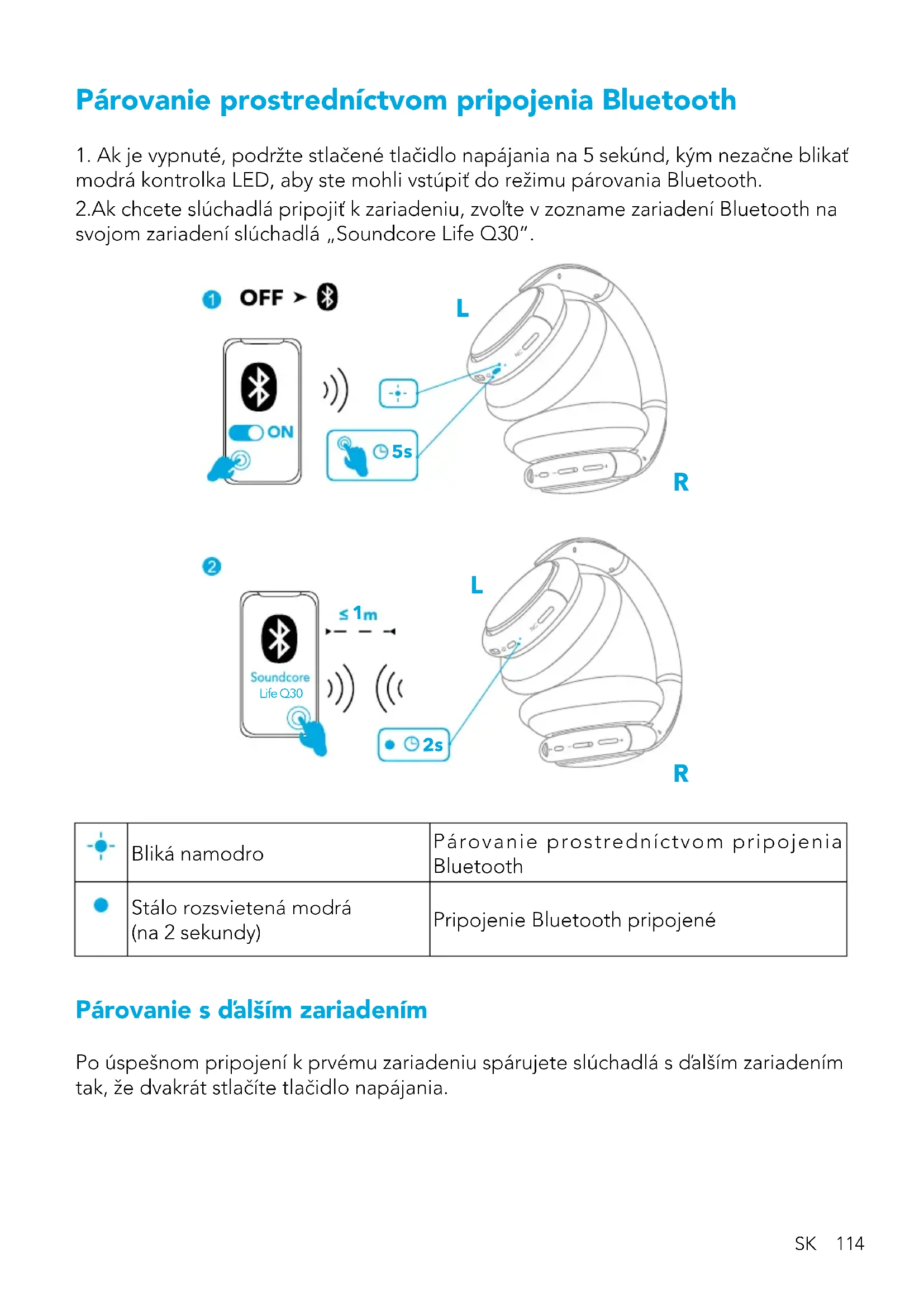 modrá kontrolka LED, aby ste mohli vstúpiť do režimu párovania Bluetooth. 2.Ak chcete slúchadlá pripojiť k zariadeniu, zvoľte v zozname zariadení Bluetooth na svojom zariadení slúchadlá „Soundcore Life Q30“.