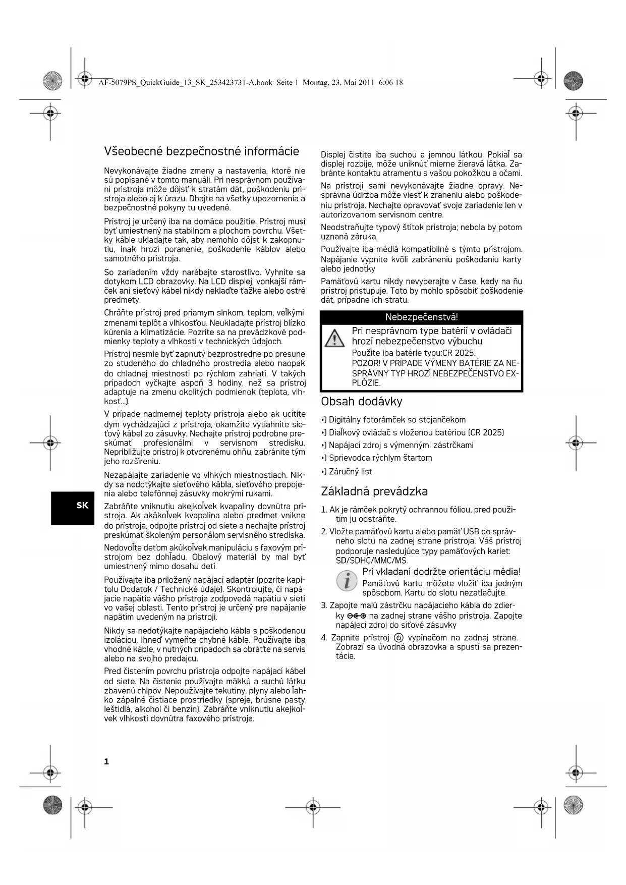 - Váš predajca zoberie staré zariadenie naspäť, pokiaľ ho kupujete ako produkt s možnosťou náhrady. Odpadové zariadenie môže byť uskladnené na zber- ných miestach na to určených. Papier aj použitú papierovú škatuľu odovzdajte na re- cykláciu. Plastový obal a obalovú penu Styrofoam tak- tiež recyklujte alebo ju znehodnoťte v bežnom odpade podľa požiadaviek vo vašej krajine. Všetky práva vyhradené. Žiadna časť tejto publikácie nesmie byť reprodukovaná, ukladaná vo vyhľadávacích systémoch, šírená v akejkoľvek forme, elektronicky, mechanicky, kopírovaním, nahrávaním alebo inak bez predchádzajúceho písaného súhlasu AgfaPhoto. Tu obsiahnuté informácie slúžia len na použitie s týmto produktom. AgfaPhoto nenesie žiadnu zodpovednosť, ak je táto informácia vztiahnutá na iný prístroj. Tento užívateľský manuál je dokument, ktorý nerepre- zentuje kontrakt. Chyby, tlačové chyby a zmeny rezervované. Copyright © 2011 Sagemcom Rozlíšenie 720¦×¦480¦bodov Vnútorná pamäť až na 5 fotografií (s funkciou interného kopírovania) USB port max. prúdové zaťaženie USB-Host < 250¦mA Kompatibilné pamäťové karty SD/SDHC/MMC/MS Fotoformáty JPEG Formáty súborov *.jpg Výrobca Shenzhen HONOR Electronic Co., Ltd. Č. modelu ADS-5N-06 05005G-A0 Vstup 100¦–¦240¦V¦~ / 50¦/¦60¦Hz Výstup 5¦V¦† / 1¦A AF-5079PS_QuickGuide_13_SK_253423731-A.book Seite 3 Montag, 23. Mai 2011 6:06 181