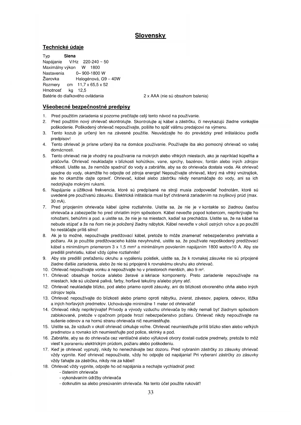 4. Tento ohrievač je prísne určený iba na domáce používanie. Používajte iba ako pomocný ohrievač vo vašej