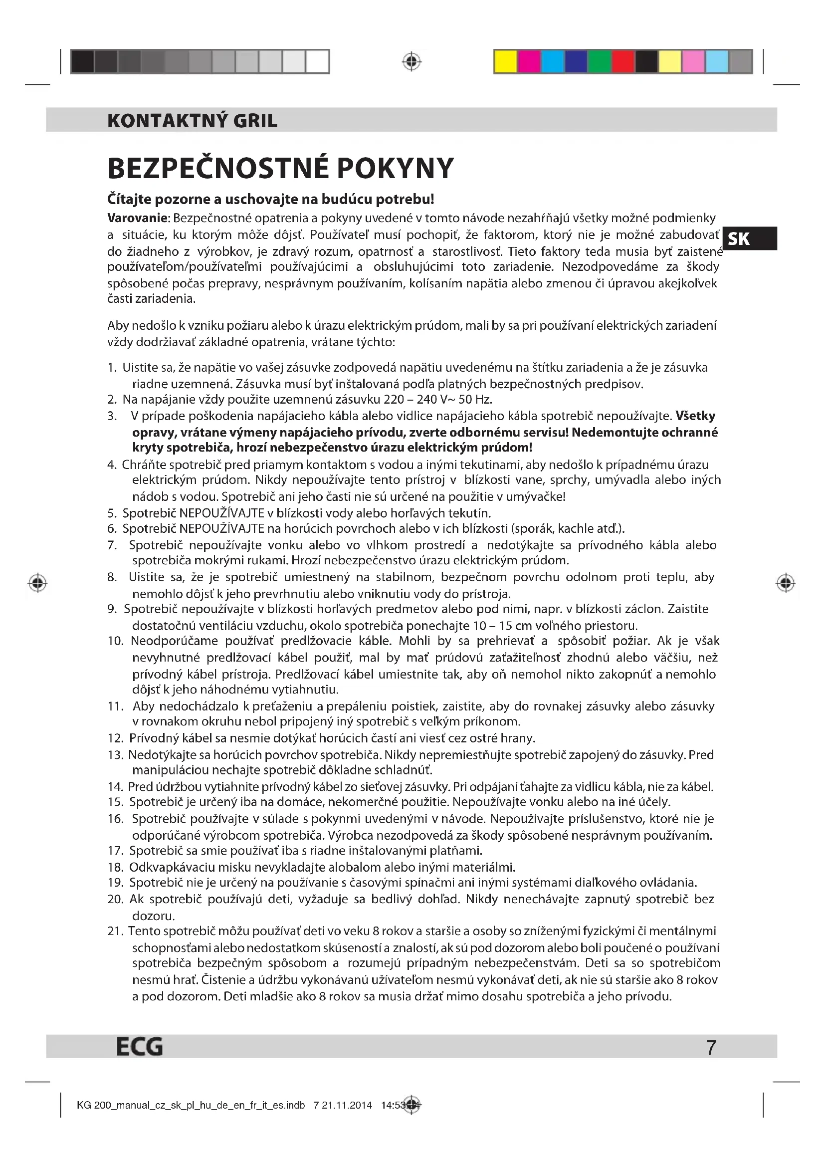 Baliaci papier avlnitá lepenka – odovzdajte do zberných surovín. Prebalová fólia, PE vrecká, plastové diely – vyhadzujte do kontajnerov na plasty. LIKVIDÁCIA VÝROBKU PO SKONČENÍ ŽIVOTNOSTI Likvidácia použitých elektrických aelektronických zariadení (platí včlenských krajinách EÚ aďalších európskych krajinách so zavedeným systémom triedenia odpadu) Vyobrazený symbol na produkte alebo na obale znamená, že sproduktom by sa nemalo nakladať ako sdomovým odpadom. Produkt odovzdajte na miesto určené na recykláciu elektrických aelektronických zariadení. Správnou likvidáciou produktu zabránite negatívnym vplyvom na ľudské zdravie a životné prostredie. Recyklácia materiálov prispieva kochrane prírodných zdrojov. Viac informácií orecyklácii tohto produktu vám poskytne obecný úrad, organizácia na spracovanie domového odpadu alebo predajné miesto, kde ste produkt kúpili. Tento výrobok spĺňa požiadavky smerníc EÚ o elektromagnetickej kompatibilite a elektrickej bezpečnosti. Návod na obsluhu je k dispozícii na webových stránkach www.ecg.sk. Zmena textu a technických parametrov vyhradená. 08/05KG 200_manual_cz_sk_pl_hu_de_en_fr_it_es.indb 9 21.11.2014 14:53:24PL GRILL KONTAKTOWY