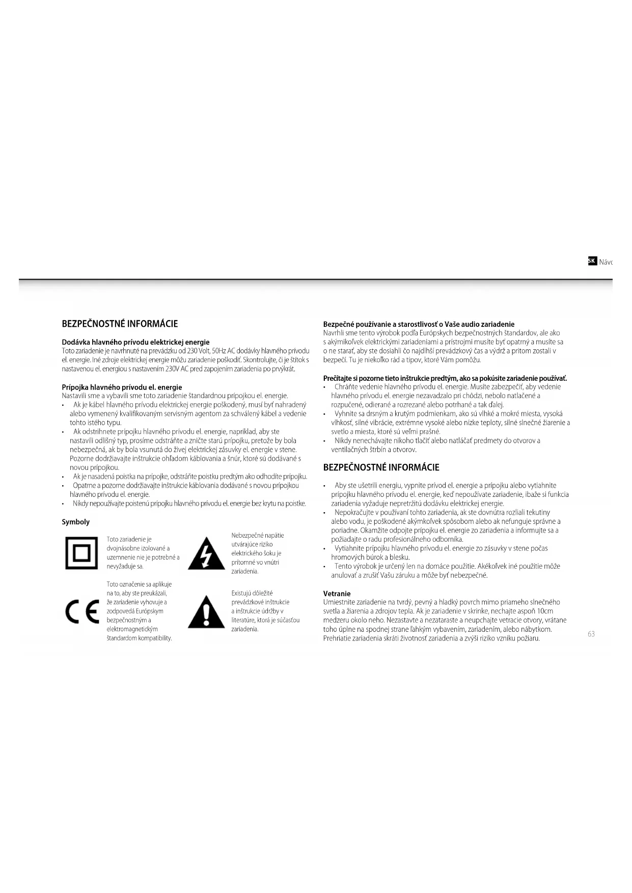 - Nikdy nepoužívajte poistenú prípojku hlavného prívodu el. energie bez krytu na poistke. Symboly Toto zariadenie je dvojnásobne izolované a uzemnenie nie je potrebné a nevyžaduje sa. Nebezpečné napätie utvárajúce riziko elektrického šoku je prítomné vo vnútri zariadenia. Toto označenie sa aplikuje na to, aby ste preukázali, že zariadenie vyhovuje a zodpovedá Európskym bezpečnostným a elektromagnetickým štandardom kompatibility. Existujú dôležité prevádzkové inštrukcie a inštrukcie údržby v literatúre, ktorá je súčasťou zariadenia. Bezpečné používanie a starostlivosť o Vaše audio zariadenie Navrhli sme tento výrobok podľa Európskych bezpečnostných štandardov, ale ako s akýmikoľvek elektrickými zariadeniami a prístrojmi musíte byť opatrný a musíte sa o ne starať, aby ste dosiahli čo najdlhší prevádzkový čas a výdrž a pritom zostali v bezpečí. Tu je niekoľko rád a tipov, ktoré Vám pomôžu. Prečítajte si pozorne tieto inštrukcie predtým, ako sa pokúsite zariadenie používať.