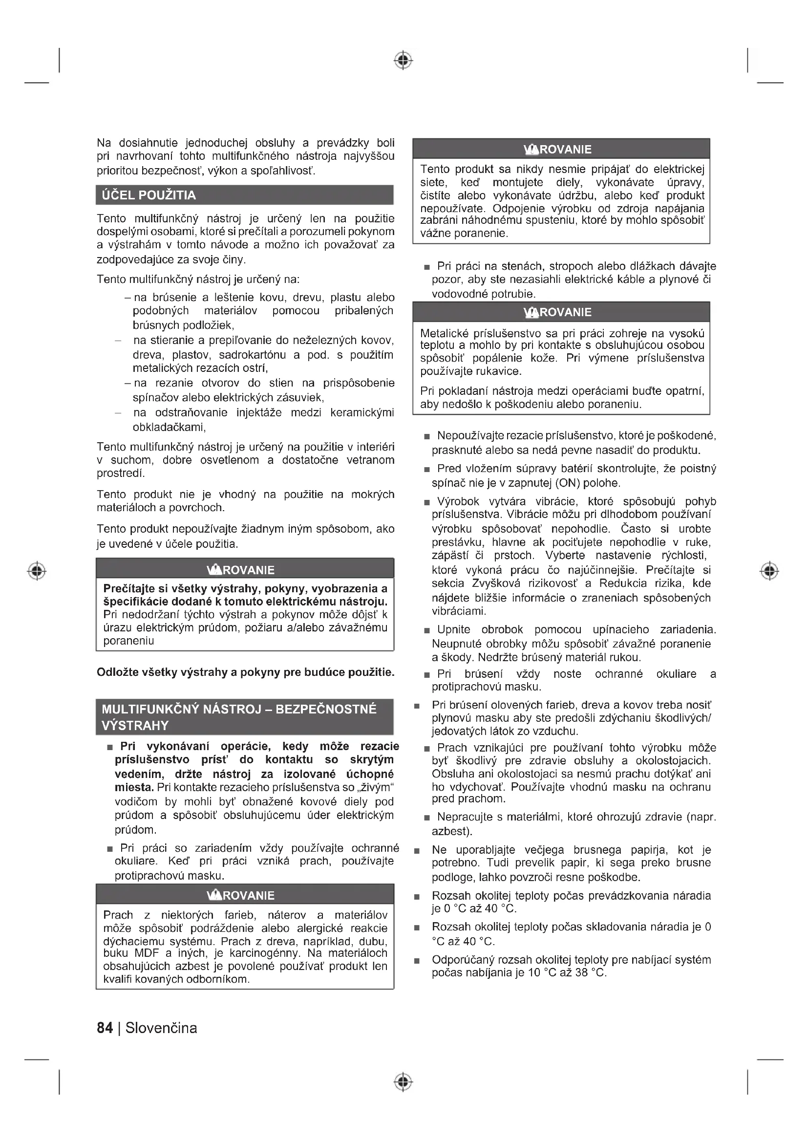 Tento multifunkčný nástroj je určený len na použitie dospelými osobami, ktoré si prečítali a porozumeli pokynom a výstrahám v tomto návode a možno ich považovať za zodpovedajúce za svoje činy. Tento multifunkčný nástroj je určený na: – na brúsenie a leštenie kovu, drevu, plastu alebo podobných materiálov pomocou pribalených brúsnych podložiek, – na stieranie a prepiľovanie do neželezných kovov, dreva, plastov, sadrokartónu a pod. s použitím metalických rezacích ostrí, – na rezanie otvorov do stien na prispôsobenie spínačov alebo elektrických zásuviek, – na odstraňovanie injektáže medzi keramickými obkladačkami, Tento multifunkčný nástroj je určený na použitie v interiéri v suchom, dobre osvetlenom a dostatočne vetranom prostredí. Tento produkt nie je vhodný na použitie na mokrých materiáloch a povrchoch. Tento produkt nepoužívajte žiadnym iným spôsobom, ako je uvedené v účele použitia. VAROVANIE Prečítajte si všetky výstrahy, pokyny, vyobrazenia a špecifikácie dodané k tomuto elektrickému nástroju. Pri nedodržaní týchto výstrah a pokynov môže dôjsť k úrazu elektrickým prúdom, požiaru a/alebo závažnému poraneniu Odložte všetky výstrahy a pokyny pre budúce použitie.