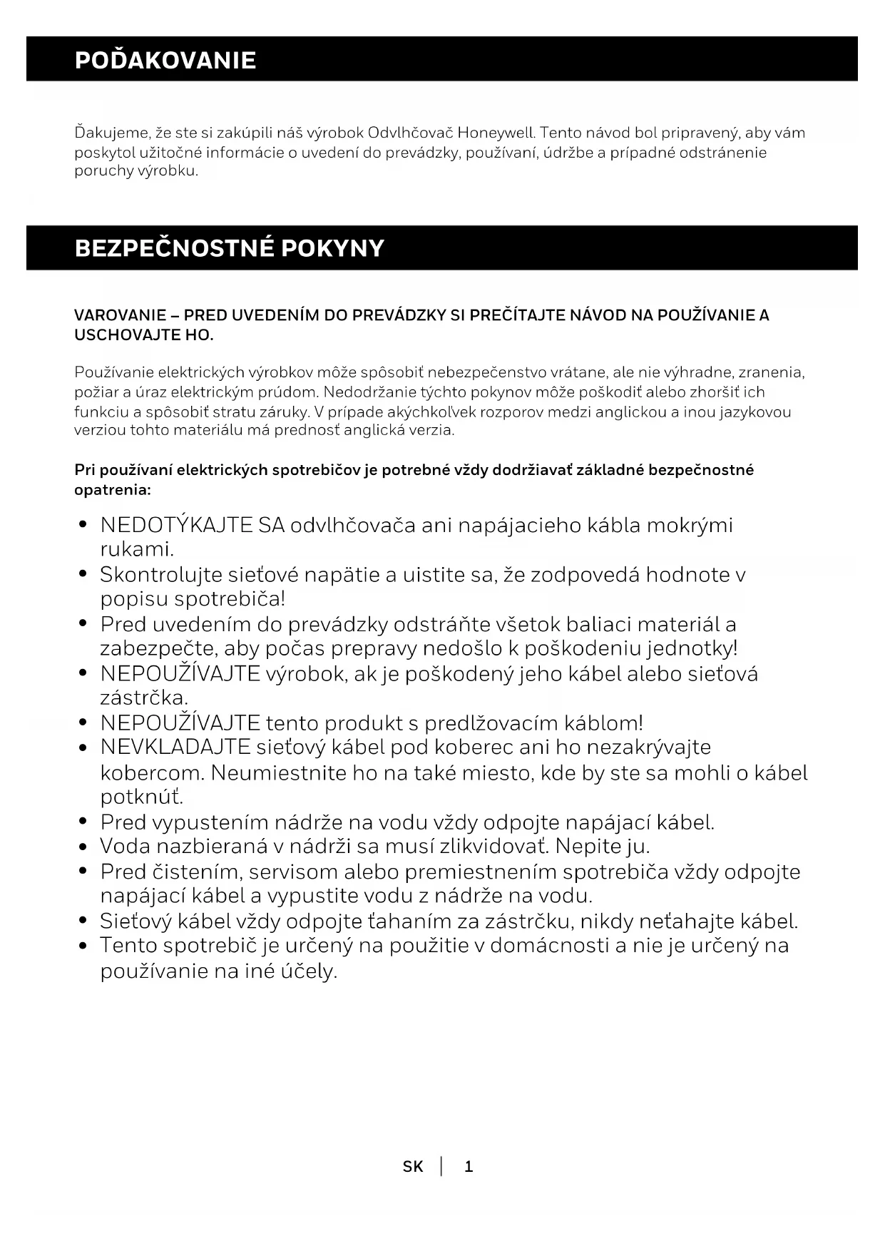 Ďakujeme, že ste si zakúpili náš výrobok Odvlhčovač Honeywell. Tento návod bol pripravený, aby vám poskytol užitočné informácie o uvedení do prevádzky, používaní, údržbe a prípadné odstránenie poruchy výrobku. VAROVANIE – PRED UVEDENÍM DO PREVÁDZKY SI PREČÍTAJTE NÁVOD NA POUŽÍVANIE A USCHOVAJTE HO. Používanie elektrických výrobkov môže spôsobiť nebezpečenstvo vrátane, ale nie výhradne, zranenia, požiar a úraz elektrickým prúdom. Nedodržanie týchto pokynov môže poškodiť alebo zhoršiť ich funkciu a spôsobiť stratu záruky. V prípade akýchkoľvek rozporov medzi anglickou a inou jazykovou verziou tohto materiálu má prednosť anglická verzia. Pri používaní elektrických spotrebičov je potrebné vždy dodržiavať základné bezpečnostné opatrenia: