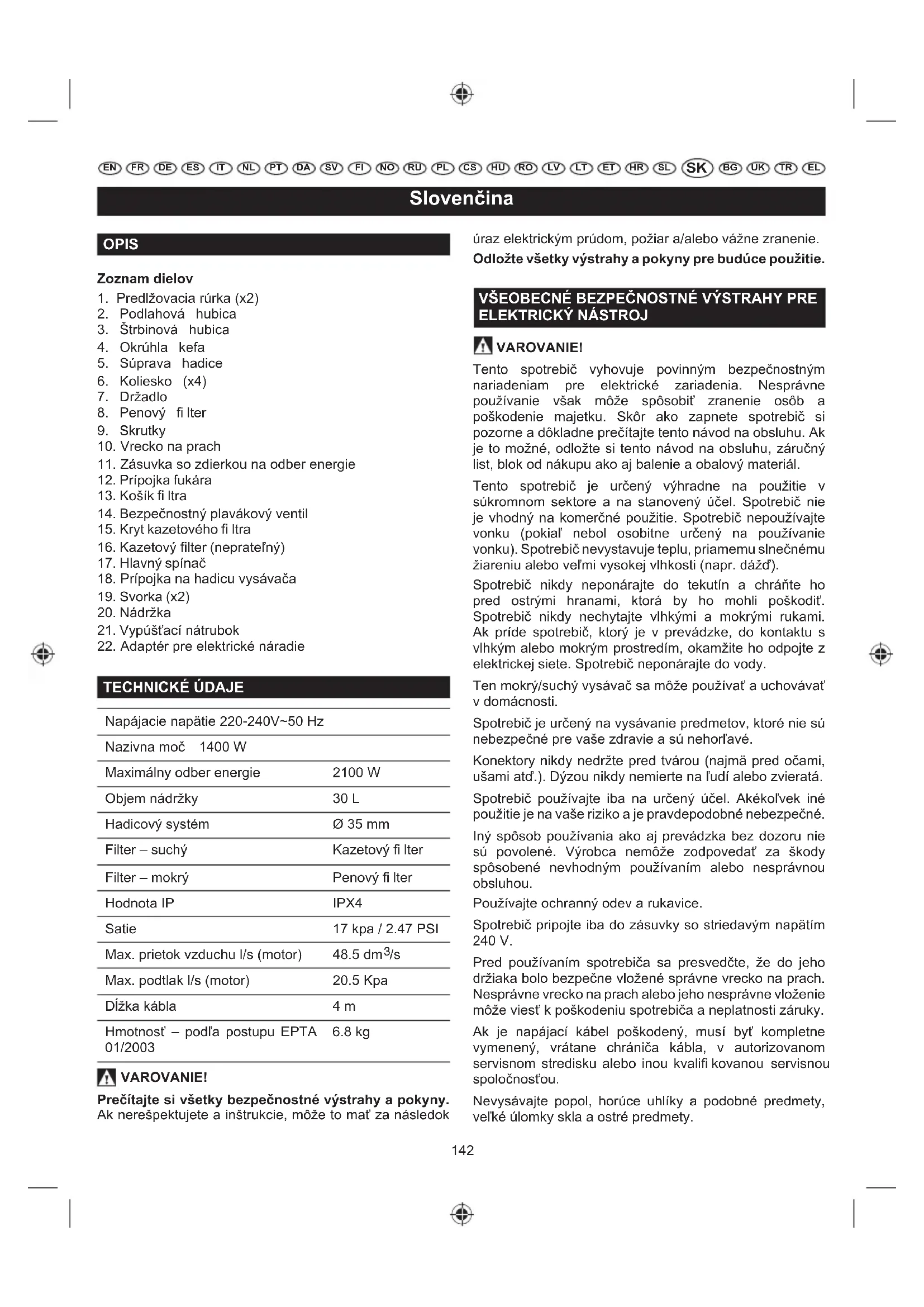 VAROVANIE! Tento spotrebič vyhovuje povinným bezpečnostným nariadeniam pre elektrické zariadenia. Nesprávne používanie však môže spôsobiť zranenie osôb a poškodenie majetku. Skôr ako zapnete spotrebič si pozorne a dôkladne prečítajte tento návod na obsluhu. Ak je to možné, odložte si tento návod na obsluhu, záručný list, blok od nákupu ako aj balenie a obalový materiál. Tento spotrebič je určený výhradne na použitie v súkromnom sektore a na stanovený účel. Spotrebič nie je vhodný na komerčné použitie. Spotrebič nepoužívajte vonku (pokiaľ nebol osobitne určený na používanie vonku). Spotrebič nevystavuje teplu, priamemu slnečnému žiareniu alebo veľmi vysokej vlhkosti (napr. dážď). Spotrebič nikdy neponárajte do tekutín a chráňte ho pred ostrými hranami, ktorá by ho mohli poškodiť. Spotrebič nikdy nechytajte vlhkými a mokrými rukami. Ak príde spotrebič, ktorý je v prevádzke, do kontaktu s vlhkým alebo mokrým prostredím, okamžite ho odpojte z elektrickej siete. Spotrebič neponárajte do vody. Ten mokrý/suchý vysávač sa môže používať a uchovávať v domácnosti. Spotrebič je určený na vysávanie predmetov, ktoré nie sú nebezpečné pre vaše zdravie a sú nehorľavé. Konektory nikdy nedržte pred tvárou (najmä pred očami, ušami atď.). Dýzou nikdy nemierte na ľudí alebo zvieratá. Spotrebič používajte iba na určený účel. Akékoľvek iné použitie je na vaše riziko a je pravdepodobné nebezpečné. Iný spôsob používania ako aj prevádzka bez dozoru nie sú povolené. Výrobca nemôže zodpovedať za škody spôsobené nevhodným používaním alebo nesprávnou obsluhou. Používajte ochranný odev a rukavice. Spotrebič pripojte iba do zásuvky so striedavým napätím 240 V. Pred používaním spotrebiča sa presvedčte, že do jeho držiaka bolo bezpečne vložené správne vrecko na prach. Nesprávne vrecko na prach alebo jeho nesprávne vloženie môže viesť k poškodeniu spotrebiča a neplatnosti záruky. Ak je napájací kábel poškodený, musí byť kompletne vymenený, vrátane chrániča kábla, v autorizovanom servisnom stredisku alebo inou kvalifi kovanou servisnou spoločnosťou. Nevysávajte popol, horúce uhlíky a podobné predmety, veľké úlomky skla a ostré predmety. OPIS Zoznam dielov