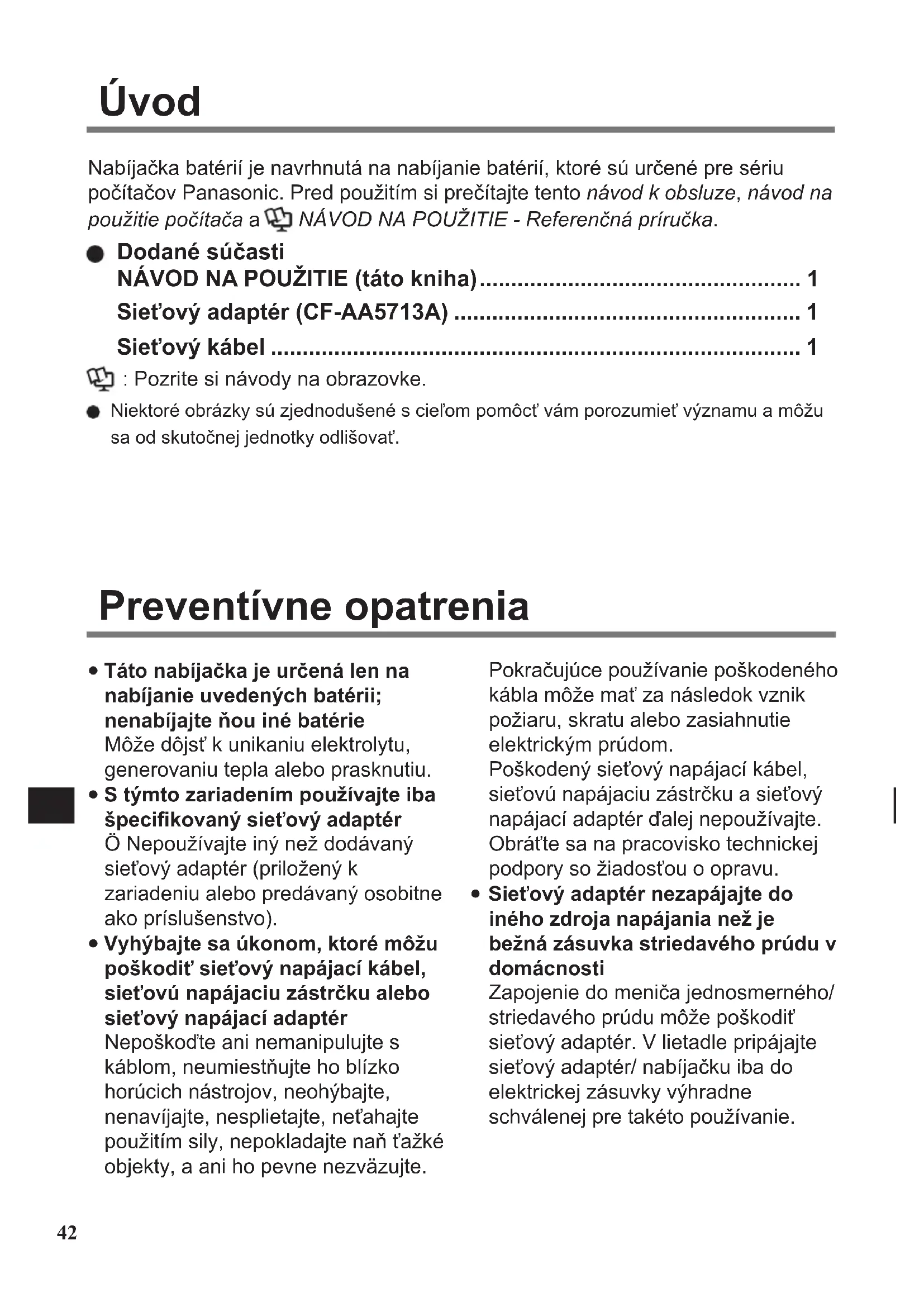 Sieťový adaptér nezapájajte do iného zdroja napájania než je bežná zásuvka striedavého prúdu v domácnosti Zapojenie do meniča jednosmerného/ striedavého prúdu môže poškodiť sieťový adaptér. V lietadle pripájajte sieťový adaptér/ nabíjačku iba do elektrickej zásuvky výhradne schválenej pre takéto používanie. Nabíjačka batérií je navrhnutá na nabíjanie batérií, ktoré sú určené pre sériu počítačov Panasonic. Pred použitím si prečítajte tento návod k obsluze, návod na použitie počítača a NÁVOD NA POUŽITIE - Referenčná príručka. Dodané súčasti