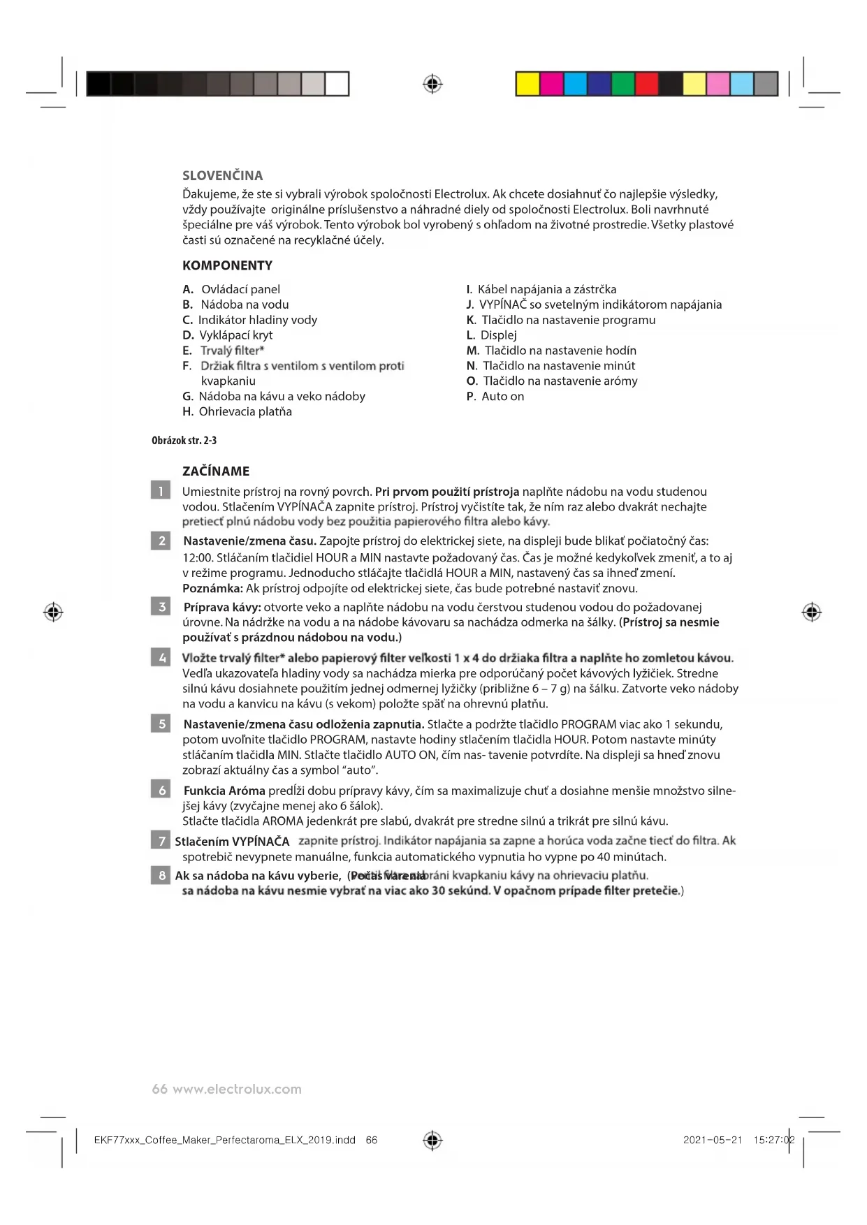 - Ak je prístroj alebo kábel napájania poškodený, musí ho vymeniť výrobca, servisný EKF77xxx_Coffee_Maker_Perfectaroma_ELX_2019.indd 67 2021-05-21 15:27:0268 www.electrolux.com