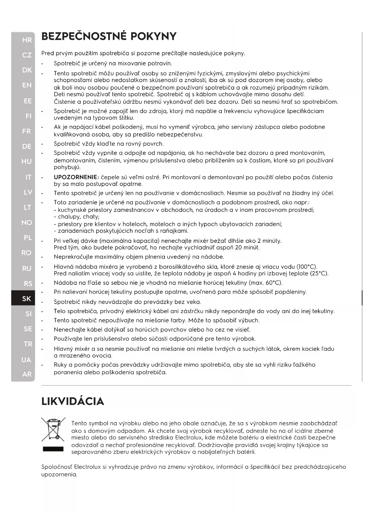 Pred prvým použitím spotrebiča si pozorne prečítajte nasledujúce pokyny. Spotrebič je určený na mixovanie potravín. Tento spotrebič môžu používať osoby so zníženými fyzickými, zmyslovými alebo psychickými schopnosťami alebo nedostatkom skúseností a znalostí, iba ak sú pod dozorom inej osoby, alebo ak boli inou osobou poučené o bezpečnom používaní spotrebiča a ak rozumejú prípadným rizikám. Deti nesmú používať tento spotrebič. Spotrebič aj s káblom uchovávajte mimo dosahu detí. Čistenie a používateľskú údržbu nesmú vykonávať deti bez dozoru. Deti sa nesmú hrať so spotrebičom. Spotrebič je možné zapojiť len do zdroja, ktorý má napätie a frekvenciu vyhovujúce špecifikáciam uvedeným na typovom štítku. Ak je napájací kábel poškodený, musí ho vymeniť výrobca, jeho servisný zástupca alebo podobne kvalifikovaná osoba, aby sa predišlo nebezpečenstvu. Spotrebič vždy klaďte na rovný povrch. Spotrebič vždy vypnite a odpojte od napájania, ak ho nechávate bez dozoru a pred montovaním, demontovaním, čistením, výmenou príslušenstva alebo priblížením sa k častiam, ktoré sa pri používaní pohybujú. UPOZORNENIE: čepele sú veľmi ostré. Pri montovaní a demontovaní po použití alebo počas čistenia by sa malo postupovať opatrne. Tento spotrebič je určený len na používanie v domácnostiach. Nesmie sa používať na žiadny iný účel. Toto zariadenie je určené na používanie v domácnostiach a podobnom prostredí, ako napr.: - kuchynské priestory zamestnancov v obchodoch, na úradoch a v inom pracovnom prostredí; - chalupy, chaty; - priestory pre klientov v hoteloch, moteloch a iných typoch ubytovacích zariadení; - zariadeniach poskytujúcich nocľah s raňajkami. Pri veľkej dávke (maximálna kapacita) nenechajte mixér bežať dlhšie ako 2 minúty. Pred tým, ako budete pokračovať, ho nechajte vychladnúť aspoň 20 minút. Neprekračujte maximálny objem plnenia uvedený na nádobe. Hlavná nádoba mixéra je vyrobená z borosilikátového skla, ktoré znesie aj vriacu vodu (100°C). Pred naliatím vriacej vody sa uistite, že teplota nádoby je aspoň 4 hodiny pri izbovej teplote (25°C). Nádoba na fľaše so sebou nie je vhodná na miešanie horúcej tekutiny (max. 60°C). Pri nalievaní horúcej tekutiny postupujte opatrne, uvoľnená para môže spôsobiť popáleniny. Spotrebič nikdy neuvádzajte do prevádzky bez veka. Telo spotrebiča, prívodný elektrický kábel ani zástrčku nikdy neponárajte do vody ani do inej tekutiny. Tento spotrebič nepoužívajte na miešanie farby. Môže to spôsobiť výbuch. Nenechajte kábel dotýkať sa horúcich povrchov alebo ho cez ne visieť. Používajte len príslušenstvo alebo súčasti odporúčané pre tento výrobok. Hlavný mixér a sa nesmie používať na miešanie ani mletie tvrdých a suchých látok, okrem kociek ľadu a mrazeného ovocia. Ruky a pomôcky počas prevádzky udržiavajte mimo spotrebiča, aby ste sa vyhli riziku ťažkého poranenia alebo poškodenia spotrebiča. LIKVIDÁCIA Tento symbol na výrobku alebo na jeho obale označuje, že sa s výrobkom nesmie zaobchádzať ako s domovým odpadom. Ak chcete svoj výrobok recyklovať, odneste ho na of iciálne zberné miesto alebo do servisného strediska Electrolux, kde môžete batériu a elektrické časti bezpečne odovzdať a nechať profesionálne recyklovať. Dodržiavajte pravidlá svojej krajiny týkajúce sa separovaného zberu elektrických výrobkov a nabíjateľných batérií. Spoločnosť Electrolux si vyhradzuje právo na zmenu výrobkov, informácií a špecifikácií bez predchádzajúceho upozornenia.
