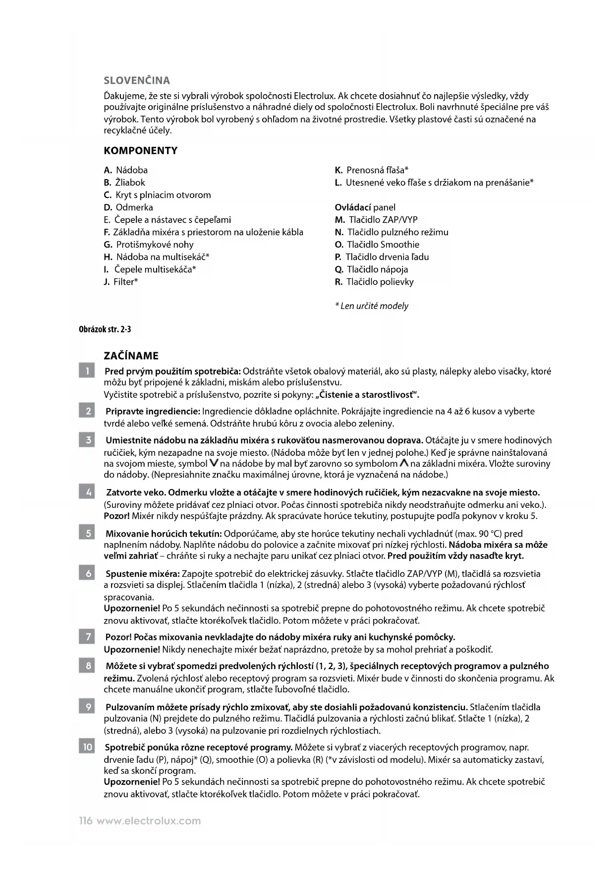 - Len určité modely Obrázok str. 2-3 ZAČÍNAME 1 Pred prvým použitím spotrebiča: Odstráňte všetok obalový materiál, ako sú plasty, nálepky alebo visačky, ktoré môžu byť pripojené k základni, miskám alebo príslušenstvu. Vyčistite spotrebič a príslušenstvo, pozrite si pokyny: „Čistenie a starostlivosť“. 2 Pripravte ingrediencie: Ingrediencie dôkladne opláchnite. Pokrájajte ingrediencie na 4 až 6 kusov a vyberte tvrdé alebo veľké semená. Odstráňte hrubú kôru z ovocia alebo zeleniny. 3 Umiestnite nádobu na základňu mixéra s rukoväťou nasmerovanou doprava. Otáčajte ju v smere hodinových ručičiek, kým nezapadne na svoje miesto. (Nádoba môže byť len v jednej polohe.) Keď je správne nainštalovaná na svojom mieste, symbol na nádobe by mal byť zarovno so symbolom na základni mixéra. Vložte suroviny do nádoby. (Nepresiahnite značku maximálnej úrovne, ktorá je vyznačená na nádobe.) 4 Zatvorte veko. Odmerku vložte a otáčajte v smere hodinových ručičiek, kým nezacvakne na svoje miesto. (Suroviny môžete pridávať cez plniaci otvor. Počas činnosti spotrebiča nikdy neodstraňujte odmerku ani veko.). Pozor! Mixér nikdy nespúšťajte prázdny. Ak spracúvate horúce tekutiny, postupujte podľa pokynov v kroku 5. 5 Mixovanie horúcich tekutín: Odporúčame, aby ste horúce tekutiny nechali vychladnúť (max. 90 °C) pred naplnením nádoby. Naplňte nádobu do polovice a začnite mixovať pri nízkej rýchlosti. Nádoba mixéra sa môže veľmi zahriať – chráňte si ruky a nechajte paru unikať cez plniaci otvor. Pred použitím vždy nasaďte kryt. 6 Spustenie mixéra: Zapojte spotrebič do elektrickej zásuvky. Stlačte tlačidlo ZAP/VYP (M), tlačidlá sa rozsvietia a rozsvieti sa displej. Stlačením tlačidla 1 (nízka), 2 (stredná) alebo 3 (vysoká) vyberte požadovanú rýchlosť spracovania. Upozornenie! Po 5 sekundách nečinnosti sa spotrebič prepne do pohotovostného režimu. Ak chcete spotrebič znovu aktivovať, stlačte ktorékoľvek tlačidlo. Potom môžete v práci pokračovať. 7 Pozor! Počas mixovania nevkladajte do nádoby mixéra ruky ani kuchynské pomôcky. Upozornenie! Nikdy nenechajte mixér bežať naprázdno, pretože by sa mohol prehriať a poškodiť. 8 Môžete si vybrať spomedzi predvolených rýchlostí (1, 2, 3), špeciálnych receptových programov a pulzného režimu. Zvolená rýchlosť alebo receptový program sa rozsvieti. Mixér bude v činnosti do skončenia programu. Ak chcete manuálne ukončiť program, stlačte ľubovoľné tlačidlo. 9 Pulzovaním môžete prísady rýchlo zmixovať, aby ste dosiahli požadovanú konzistenciu. Stlačením tlačidla pulzovania (N) prejdete do pulzného režimu. Tlačidlá pulzovania a rýchlosti začnú blikať. Stlačte 1 (nízka), 2 (stredná), alebo 3 (vysoká) na pulzovanie pri rozdielnych rýchlostiach. 10 Spotrebič ponúka rôzne receptové programy. Môžete si vybrať z viacerých receptových programov, napr. drvenie ľadu (P), nápoj* (Q), smoothie (O) a polievka (R) (*v závislosti od modelu). Mixér sa automaticky zastaví, keď sa skončí program. Upozornenie! Po 5 sekundách nečinnosti sa spotrebič prepne do pohotovostného režimu. Ak chcete spotrebič znovu aktivovať, stlačte ktorékoľvek tlačidlo. Potom môžete v práci pokračovať.117www.electrolux.com