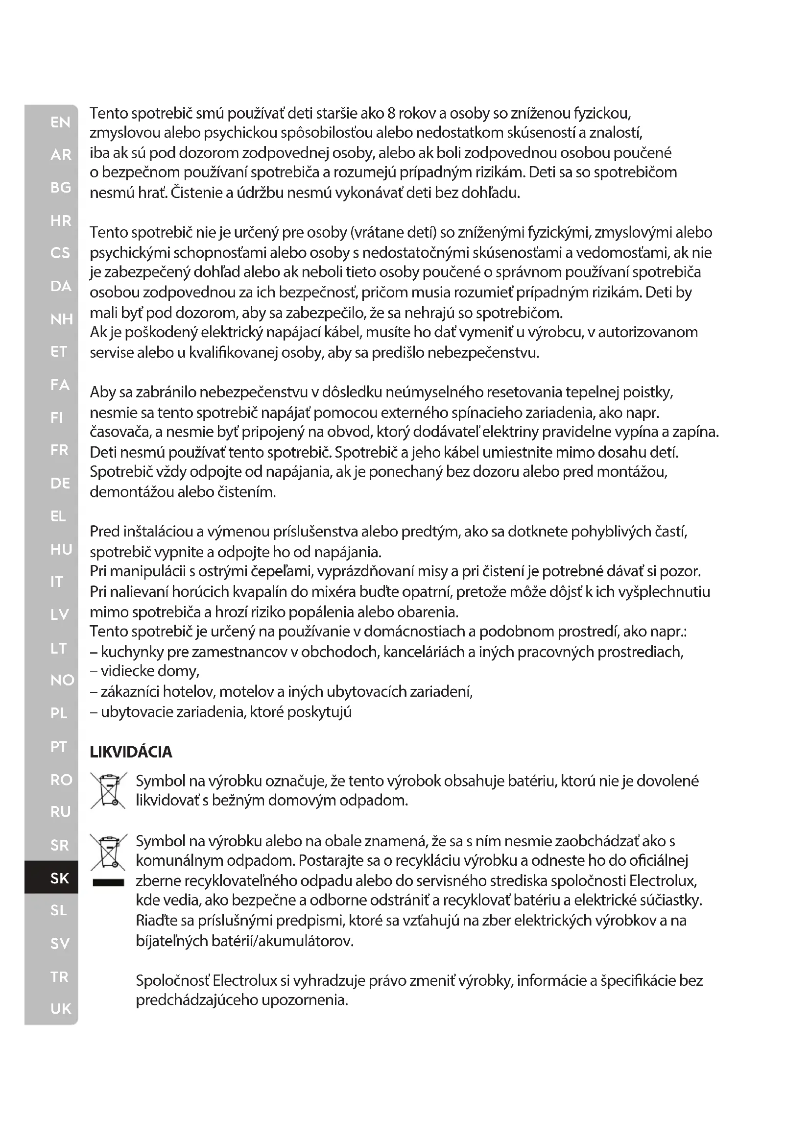 Tento spotrebič smú používať deti staršie ako 8 rokov a osoby so zníženou fyzickou, zmyslovou alebo psychickou spôsobilosťou alebo nedostatkom skúseností a znalostí, iba ak sú pod dozorom zodpovednej osoby, alebo ak boli zodpovednou osobou poučené o bezpečnom používaní spotrebiča a rozumejú prípadným rizikám. Deti sa so spotrebičom nesmú hrať. Čistenie a údržbu nesmú vykonávať deti bez dohľadu. Tento spotrebič nie je určený pre osoby (vrátane detí) so zníženými fyzickými, zmyslovými alebo psychickými schopnosťami alebo osoby s nedostatočnými skúsenosťami a vedomosťami, ak nie je zabezpečený dohľad alebo ak neboli tieto osoby poučené o správnom používaní spotrebiča osobou zodpovednou za ich bezpečnosť, pričom musia rozumieť prípadným rizikám. Deti by mali byť pod dozorom, aby sa zabezpečilo, že sa nehrajú so spotrebičom. Ak je poškodený elektrický napájací kábel, musíte ho dať vymeniť u výrobcu, v autorizovanom servise alebo u kvalikovanej osoby, aby sa predišlo nebezpečenstvu. Aby sa zabránilo nebezpečenstvu v dôsledku neúmyselného resetovania tepelnej poistky, nesmie sa tento spotrebič napájať pomocou externého spínacieho zariadenia, ako napr. časovača, a nesmie byť pripojený na obvod, ktorý dodávateľ elektriny pravidelne vypína a zapína. Deti nesmú používať tento spotrebič. Spotrebič a jeho kábel umiestnite mimo dosahu detí. Spotrebič vždy odpojte od napájania, ak je ponechaný bez dozoru alebo pred montážou, demontážou alebo čistením. Pred inštaláciou a výmenou príslušenstva alebo predtým, ako sa dotknete pohyblivých častí, spotrebič vypnitea odpojte ho od napájania. Pri manipulácii s ostrými čepeľami, vyprázdňovaní misy a pri čistení je potrebné dávať si pozor. Pri nalievaní horúcich kvapalín do mixéra buďte opatrní, pretože môže dôjsť k ich vyšplechnutiu mimo spotrebiča a hrozí riziko popálenia alebo obarenia. Tento spotrebič je určený na používanie v domácnostiach a podobnom prostredí, ako napr.: – kuchynky pre zamestnancov v obchodoch, kanceláriách a iných pracovných prostrediach, – vidiecke domy, – zákazníci hotelov, motelov a iných ubytovacích zariadení, – ubytovacie zariadenia, ktoré poskytujú LIKVIDÁCIA Symbol na výrobku označuje, že tento výrobok obsahuje batériu, ktorú nie je dovolené likvidovať s bežným domovým odpadom. Symbol na výrobku alebo na obale znamená, že sa s ním nesmie zaobchádzať ako s komunálnym odpadom. Postarajte sa o recykláciu výrobku a odneste ho do ociálnej zberne recyklovateľného odpadu alebo do servisného strediska spoločnosti Electrolux, kde vedia, ako bezpečne a odborne odstrániť a recyklovať batériu a elektrické súčiastky. Riaďte sa príslušnými predpismi, ktoré sa vzťahujú na zber elektrických výrobkov a na bíjateľných batérií/akumulátorov. Spoločnosť Electrolux si vyhradzuje právo zmeniť výrobky, informácie a špecikácie bez predchádzajúceho upozornenia.EN