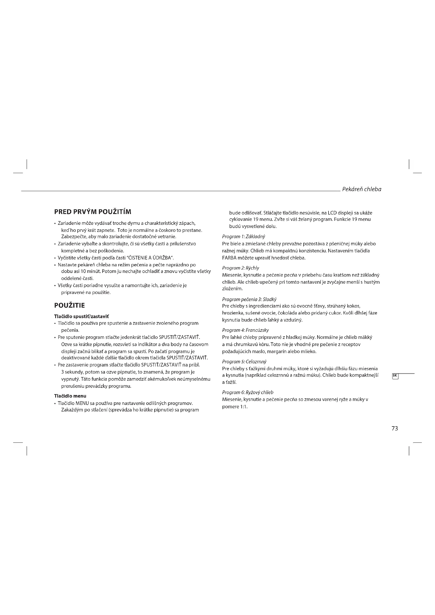 - Tlačidlo MENU sa používa pre nastavenie odlišných programov. Zakaždým po stlačení (sprevádza ho krátke pípnutie) sa program bude odlišovať. Stláčajte tlačidlo nesúvisle, na LCD displeji sa ukáže cyklovanie 19 menu. Zvľte si váš želaný program. Funkcie 19 menu budú vysvetlené dolu. Program 1: Základný Pre biele a zmiešané chleby prevažne pozostáva z pšeničnej múky alebo ražnej múky. Chlieb má kompaktnú konzistenciu. Nastavením tlačidla FARBA môžete upraviť hnedosť chleba. Program 2: Rýchly Miesenie, kysnutie a pečenie pecňa v priebehu času kratšom než základný chlieb. Ale chlieb upečený pri tomto nastavení je zvyčajne menší s hustým zložením. Pragram pečenia 3: Sladký Pre chleby s ingredienciami ako sú ovocné šťavy, strúhaný kokos, hrozienka, sušené ovocie, čokoláda alebo pridaný cukor. Kvôli dlhšej fáze kysnutia bude chlieb ľahký a vzdušný. Program 4: Francúzsky Pre ľahké chleby pripravené z hladkej múky. Normálne je chlieb mäkký a má chrumkavú kôru. Toto nie je vhodné pre pečenie z receptov požadujúcich maslo, margarín alebo mlieko. Program 5: Celozrnný Pre chleby s ťažkými druhmi múky, ktoré si vyžadujú dlhšiu fázu miesenia a kysnutia (napríklad celozrnnú a ražnú múku). Chlieb bude kompaktnejší a ťažší. Program 6: Ryžový chlieb Miesenie, kysnutie a pečenie pecňa so zmesou varenej ryže a múky v pomere 1:1.